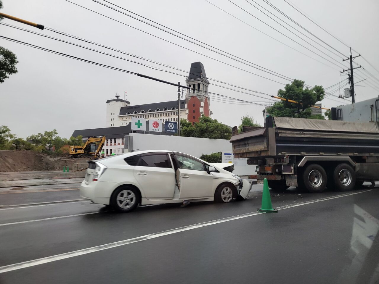 『倉敷市市役所近くの吉野家前で大型トラックと普通車による事故がありました。』