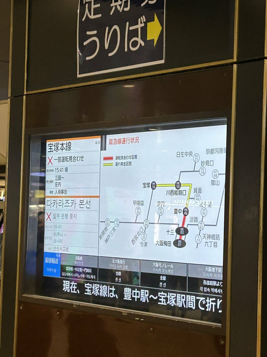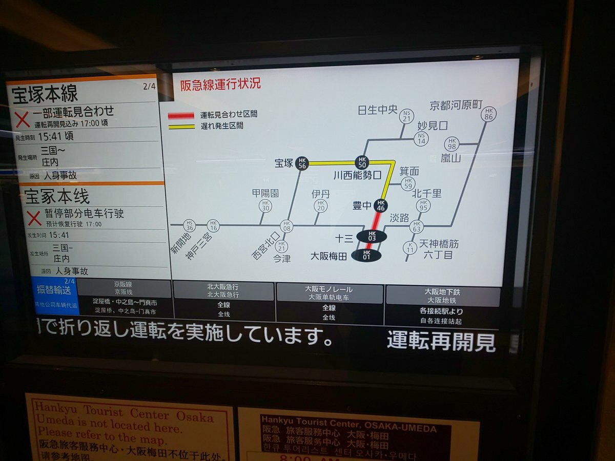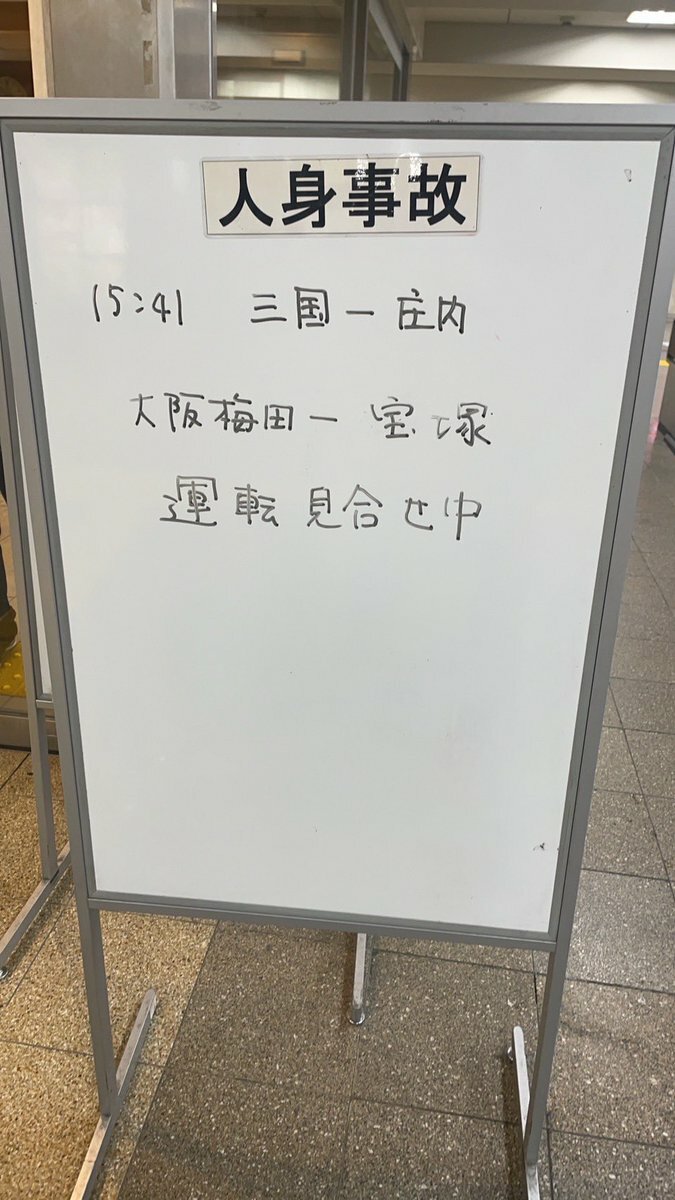 【阪急宝塚本線】15:41頃、三国〜庄内駅間で発生した人身事故の影響で、大阪梅田〜豊中駅間の運転を見合わせとってぴえん🥺 運転区間の列車に遅れが出とる。振替輸送を行っとる pic.twitter.com/a7XBIK3qu5