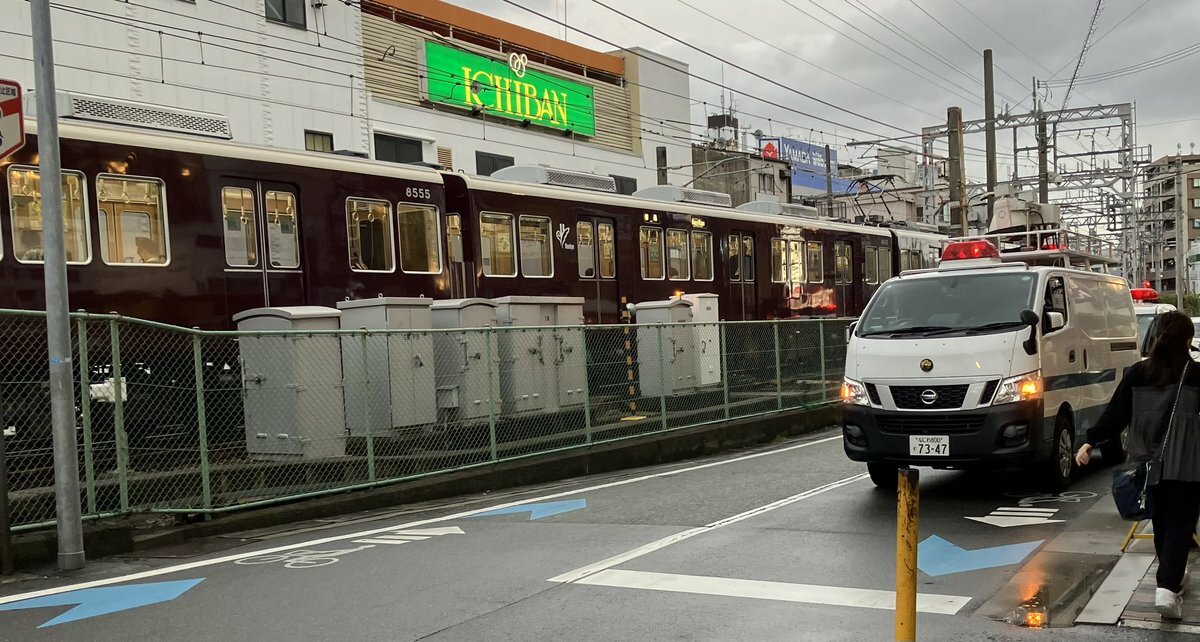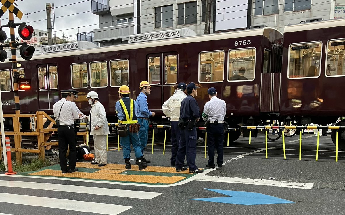 【現場の状況】『庄内駅南側の踏切に電車止まってる』#阪急宝塚本線 三国〜庄内駅で人身事故により運転見合わせ遅延11月2日 #阪急電鉄 #大阪 #豊中 #3連休