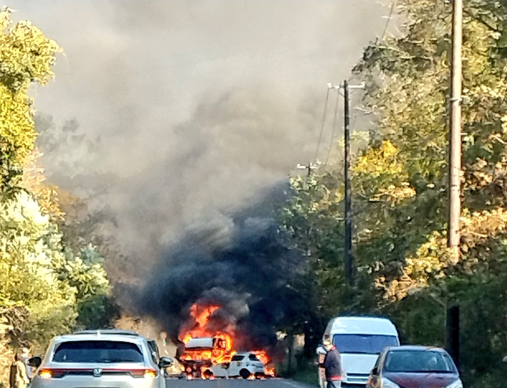【現場の状況】#交通情報 猪苗代塩川線 福島県耶麻郡磐梯町大字磐梯字清水付近 キャンピングカーなど燃える車両火災事故で一部通行止め11月3日 #福島 #磐梯町 #猪苗代 #火災 #3連休
