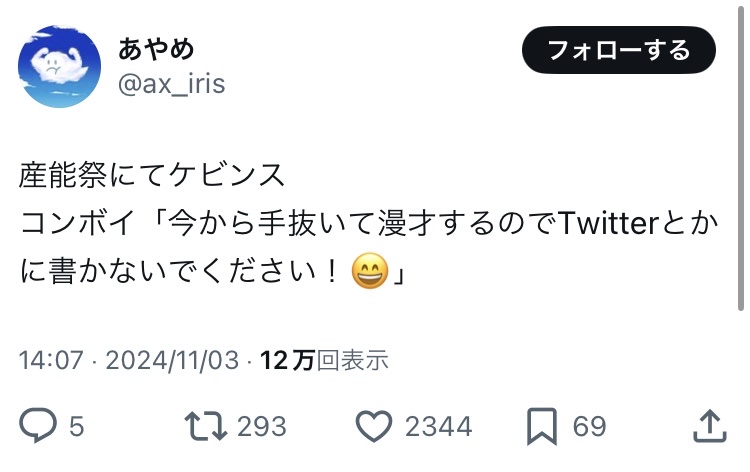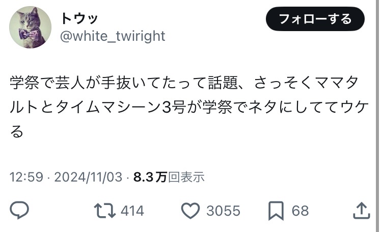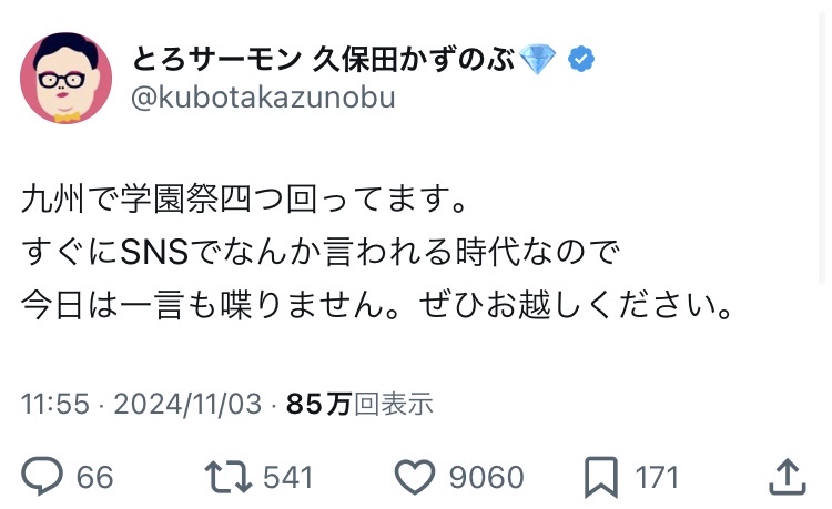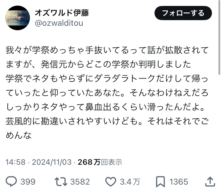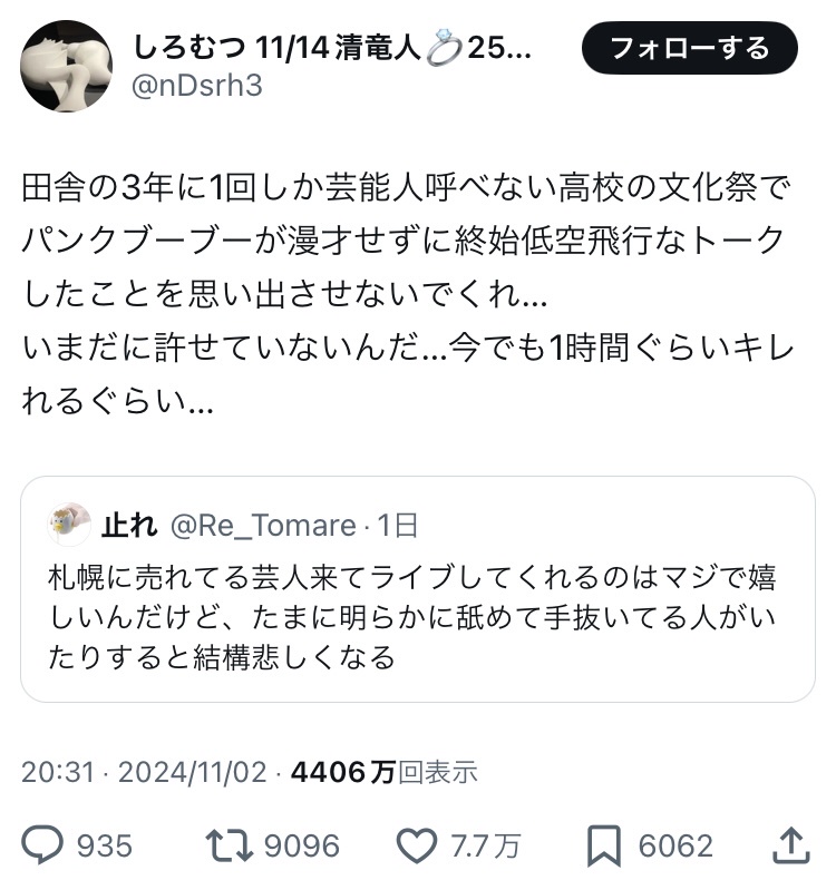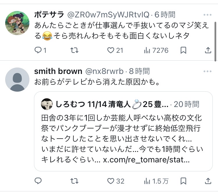 【地獄】X民「パンクブーブーがうちの文化祭に来て手を抜いていた!」→結構大事になる。。。 2024/11/3 速報 1: 発端はこのツイート(ソースは無し) パンクブーブーの黒瀬本人のXに誹謗中傷多数 他の芸人にも飛び火、さらにはネタにされる始末 document.write(” + ”); 関連記事 document.write(” + ”); 続きを読む ——— Source: アルファルファモザイク 【地獄】X民「パンクブーブーがうちの文化祭に来て手を抜いていた!」→結構大事になる。。。