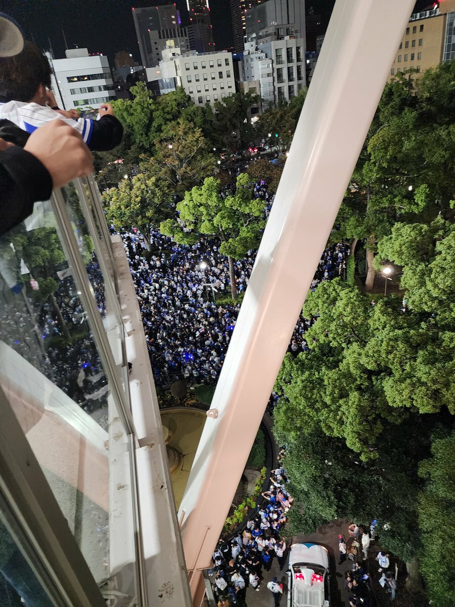 さっきちら映りした横浜公園の状況と、警察車両が続々と到着したり警備員も増えて来たというポストを見て、胴上げ観てからだともう規制されて横浜公園には入れないんじゃないかと思ってきた💦#baystars