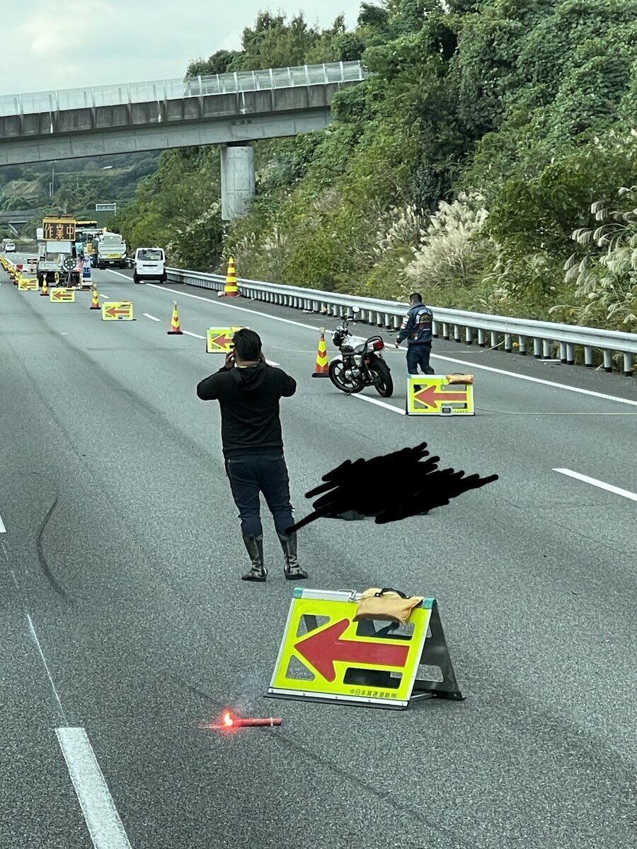 『新東名下り、駿河湾沼津サービスエリア超えた先のトンネル出たらバイクの事故。 ちゃんとヤバそうな感じでした』