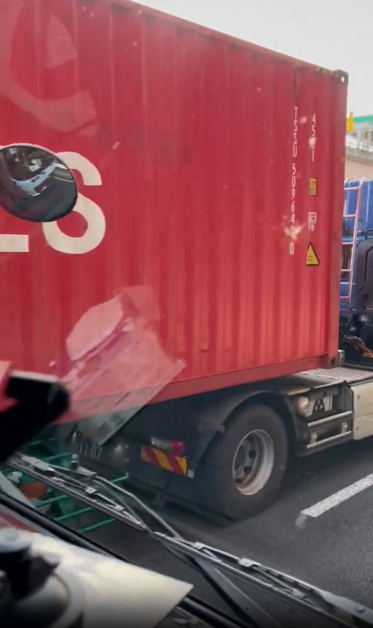 23号豊明の分岐の先で乗用車と海コンが事故ってまーす