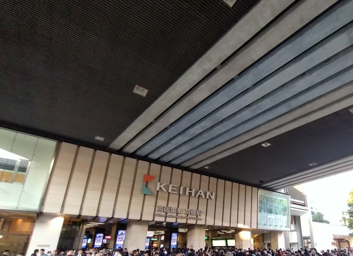 『朝イチの人身事故で、京阪線の京橋、入場規制されてる。