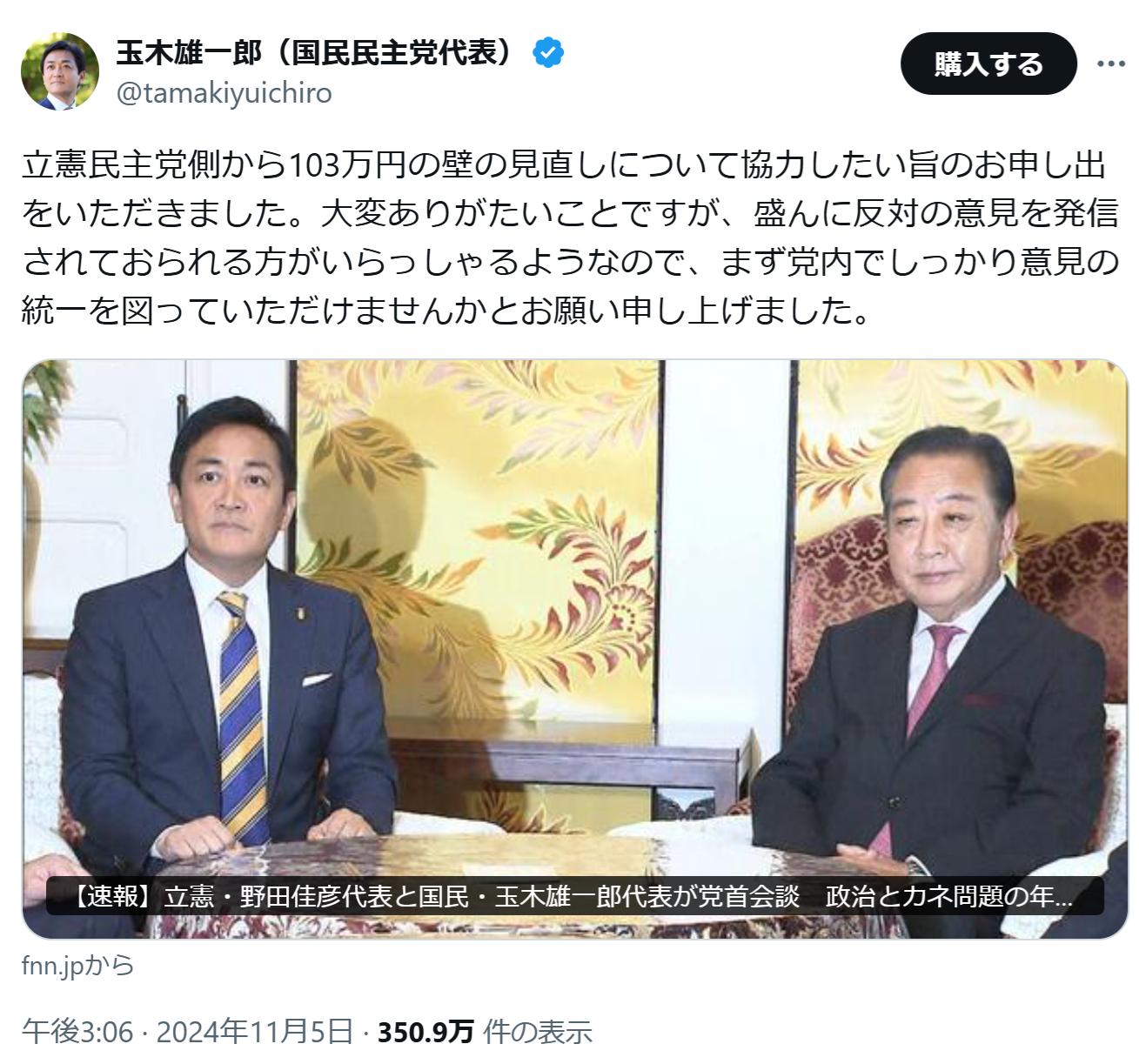 立憲民主党「玉木さん、年収の壁一緒にやらせて」 → 玉木「御党は反対派ばかりじゃないですか」 2024/11/6 速報 1: 正論でワロタ — (@tamakiyuichiro) document.write(” + ”); 関連記事 document.write(” + ”); 続きを読む ——— Source: アルファルファモザイク 立憲民主党「玉木さん、年収の壁一緒にやらせて」 → 玉木「御党は反対派ばかりじゃないですか」