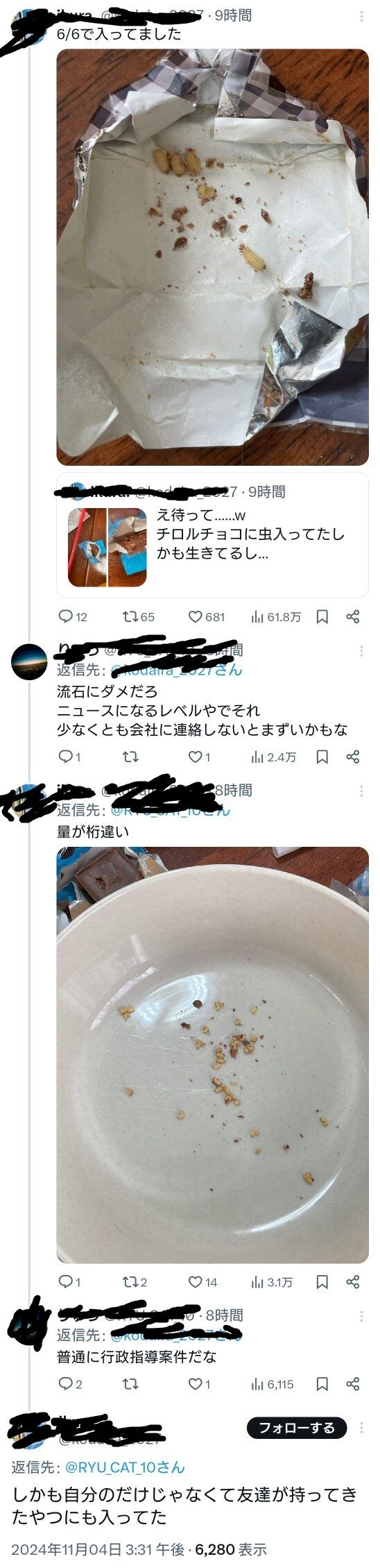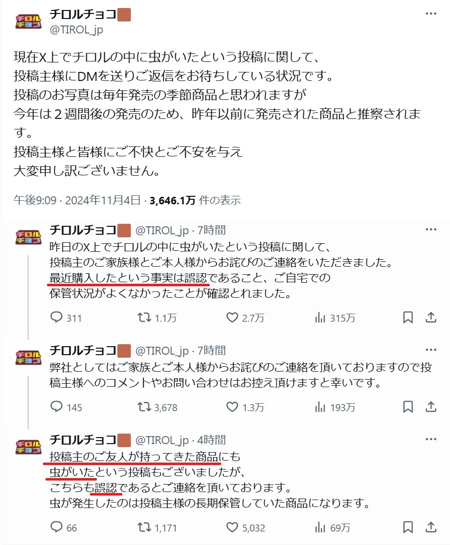 虫が発生したのは投稿主様の長期保管していた商品になります。— チロルチョコ🟫 (@TIROL_jp) November 5, 2024
