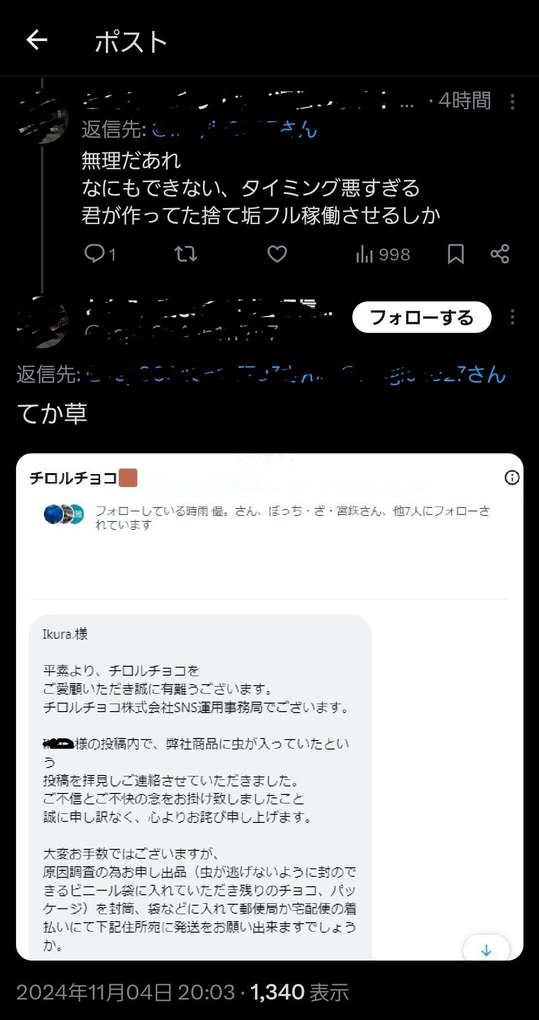 大変申し訳ございません。— チロルチョコ🟫 (@TIROL_jp) November 4, 2024