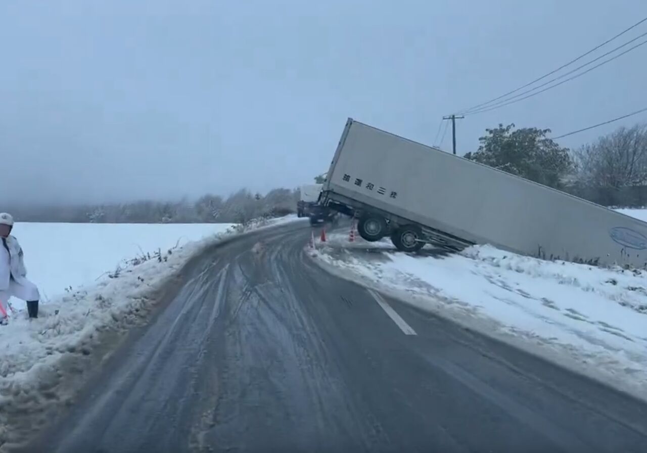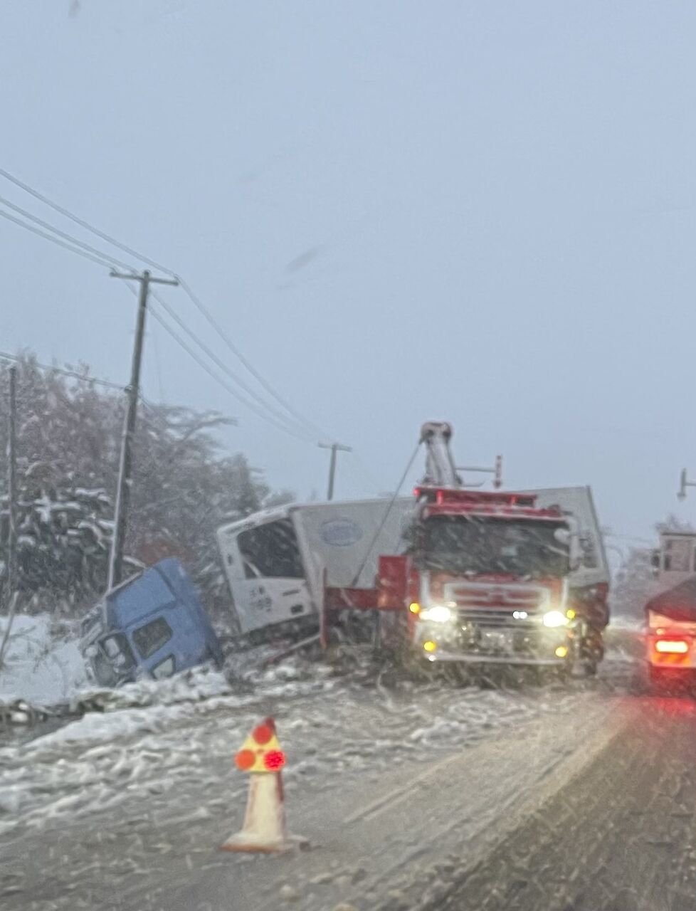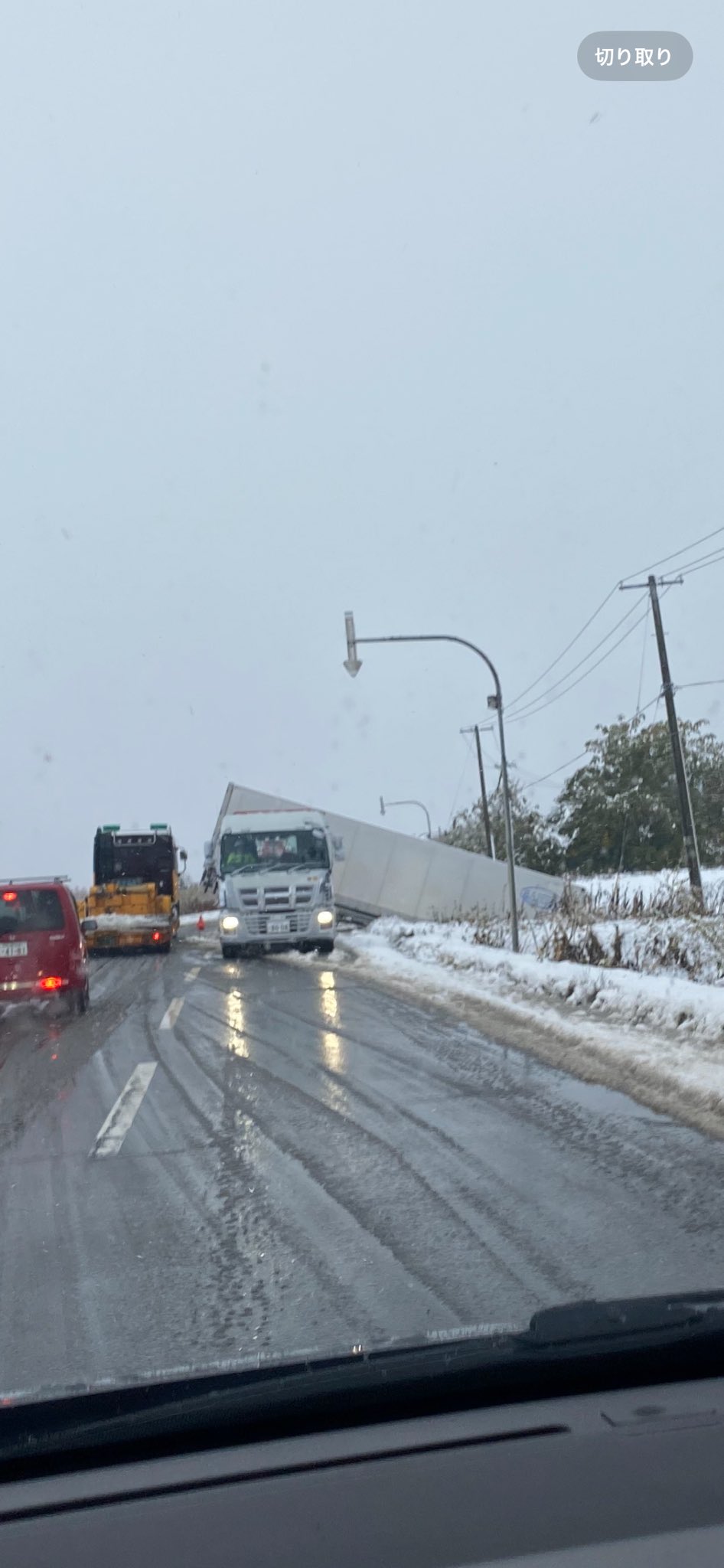 【現場の様子】#交通情報 #国道274号 北海道千歳市新川→由仁町付近 大型トレーラー道路外逸脱事故で一部交通規制11月7日 #北海道 #路面凍結 #アイスバーン