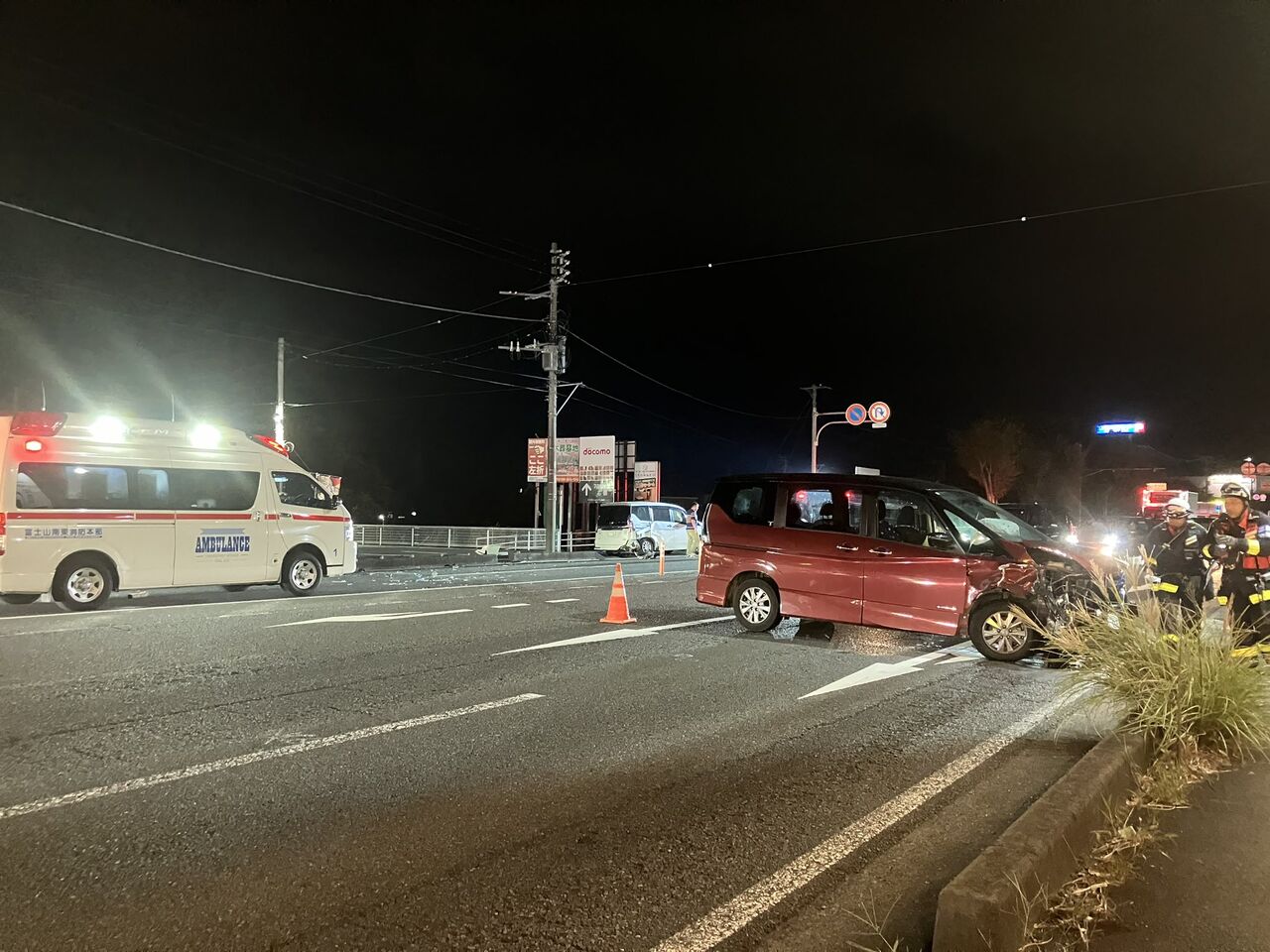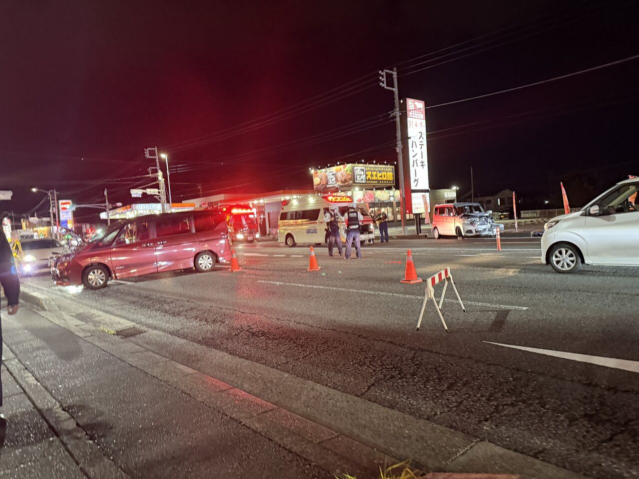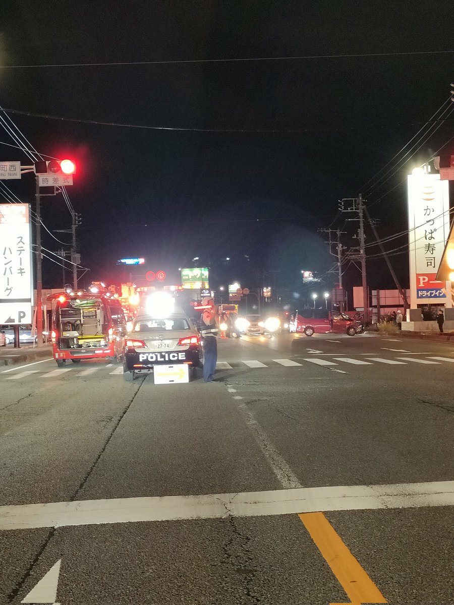 『サントムーンからちょっと行った先(かっぱ寿司前)で道路完全封鎖の事故が起きてます』