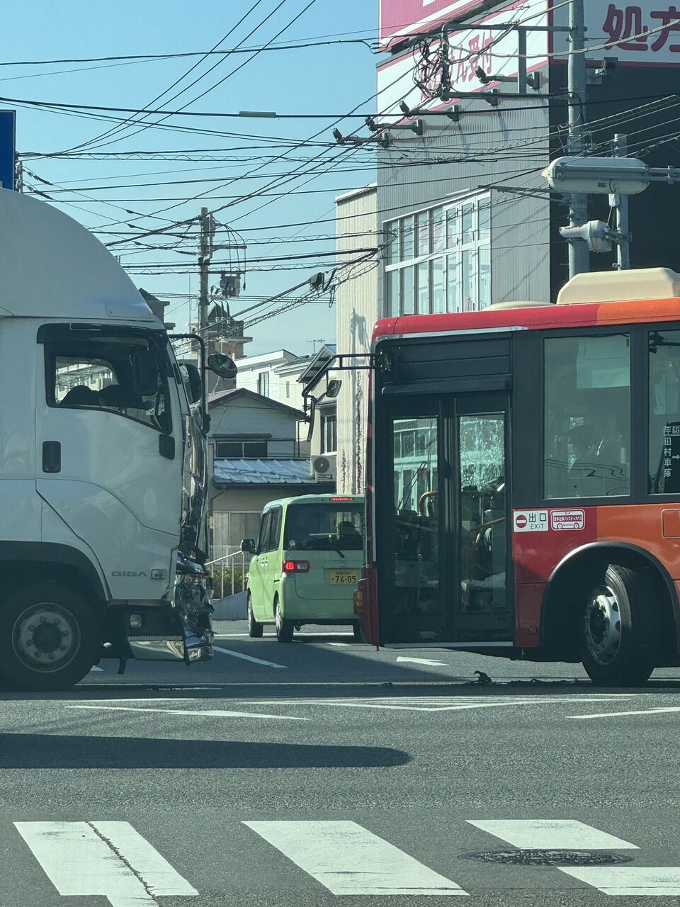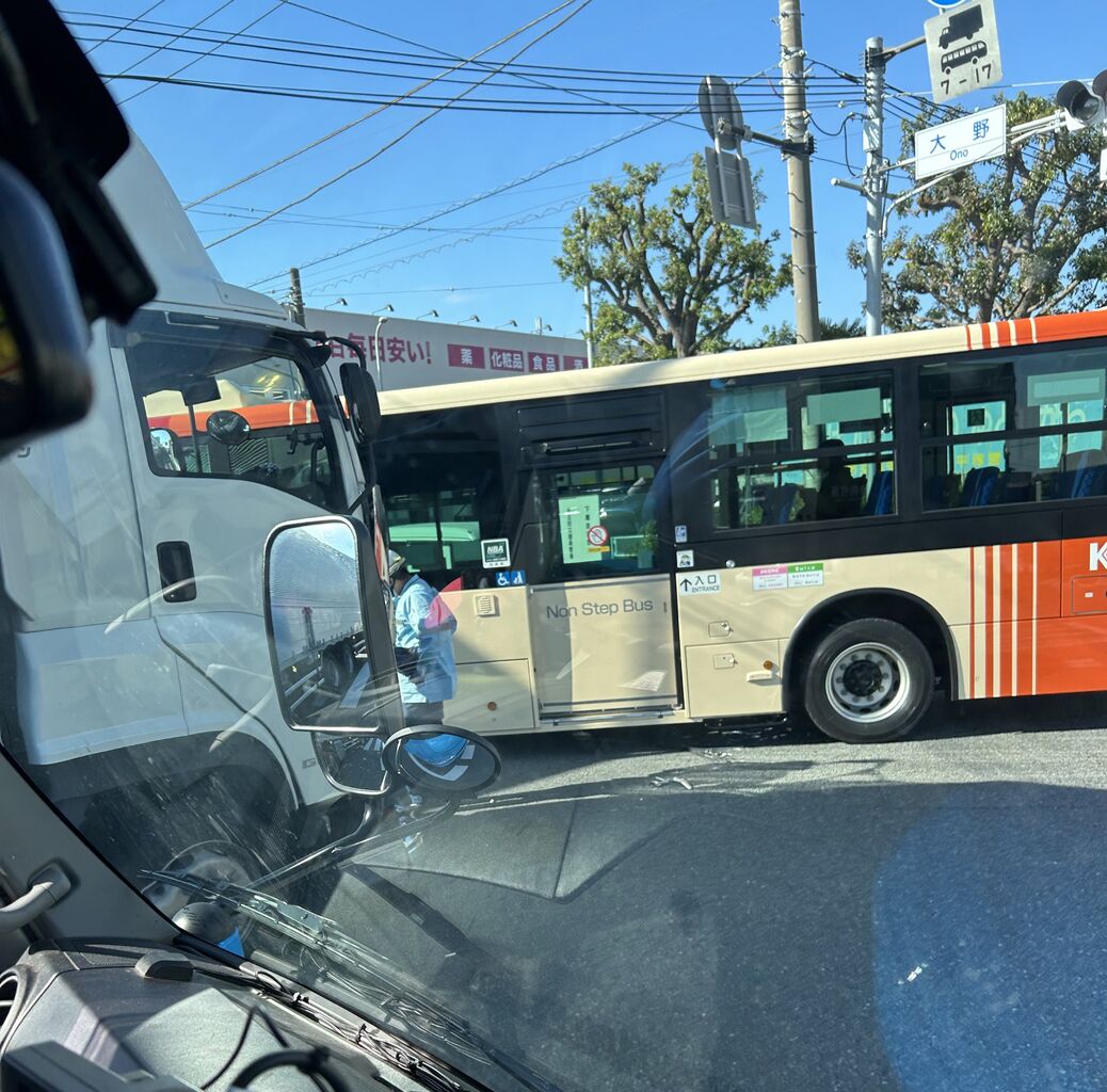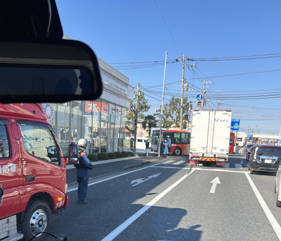 【現場の様子】#交通情報 国道129号 神奈川県平塚大野交差点トヨタコスモス付近 トラックと路線バス衝突事故で規制渋滞 神奈中バス車両フロントガラス大破11月8日 #平塚 #バス #神奈中バス