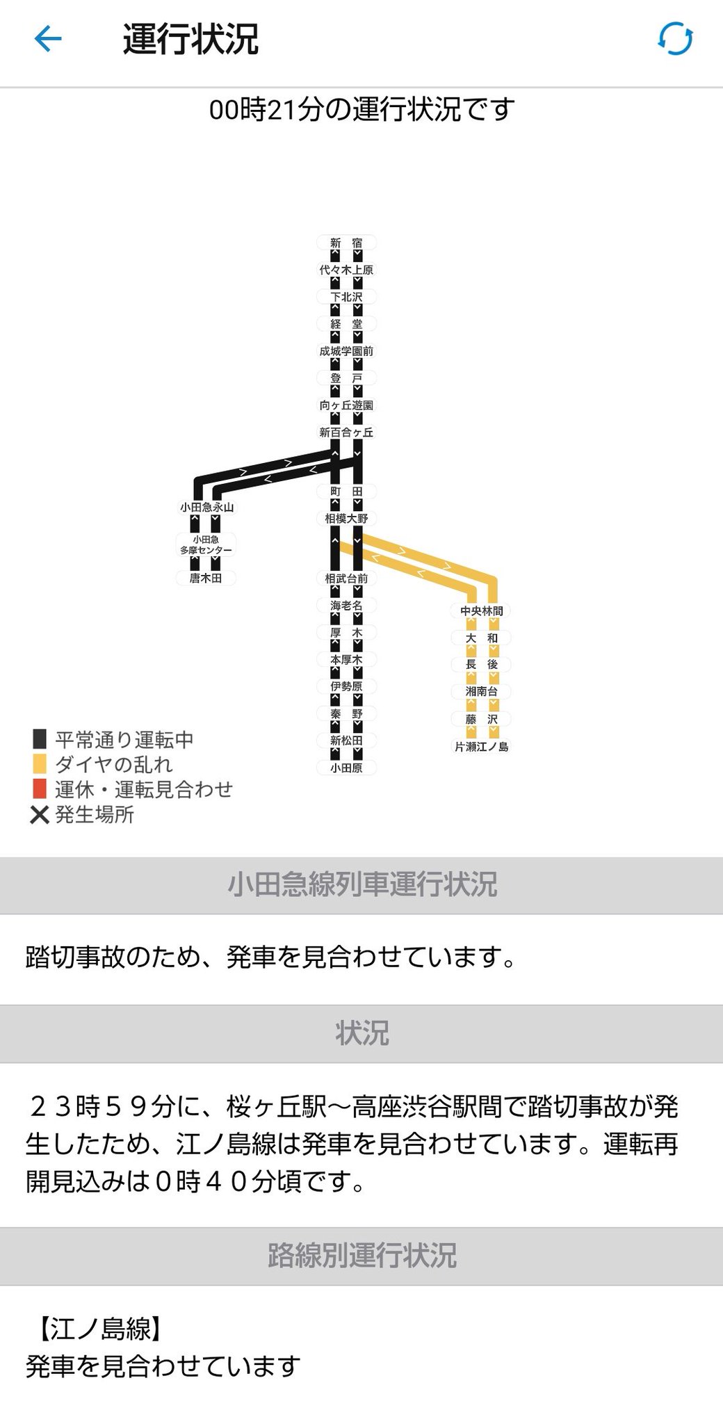 【小田急江ノ島線】23:59頃、桜ケ丘〜高座渋谷駅間で発生した踏切事故の影響で、運転を見合わせててぴえん🥺 pic.twitter.com/BteVkgDIxL