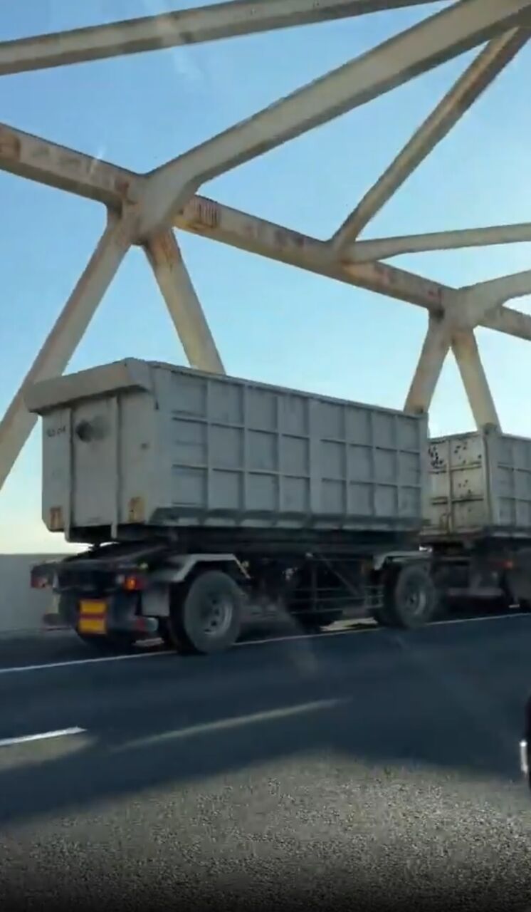 『橋の上にフルトレーラーの台車連結外れて置き去りになってた 第二通行帯に斜めになってます 台車引っ張ってるトラックどこにも居ない』