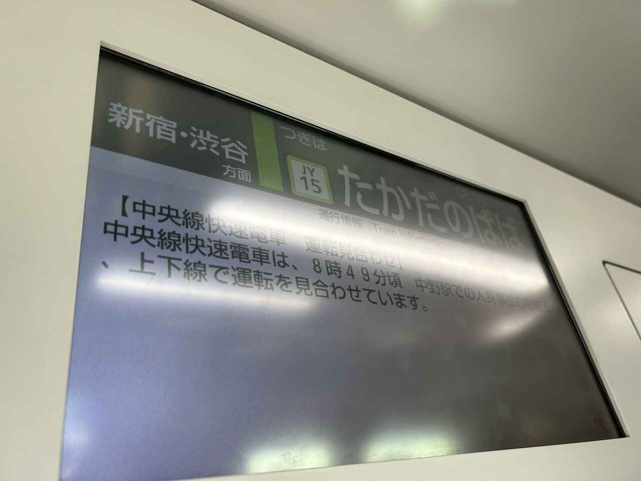中央線快速電車は、中野駅での人身事故の影響で、上下線で運転を見合わせています。運転再開は9時40分頃を見込んでいます。 #中央線快速電車 #Chuo_Line https://t.co/Bw82N3lIYZ— JR東日本【中央方面】運行情報 (公式) (@JRE_F_Chuo) November 12, 2024