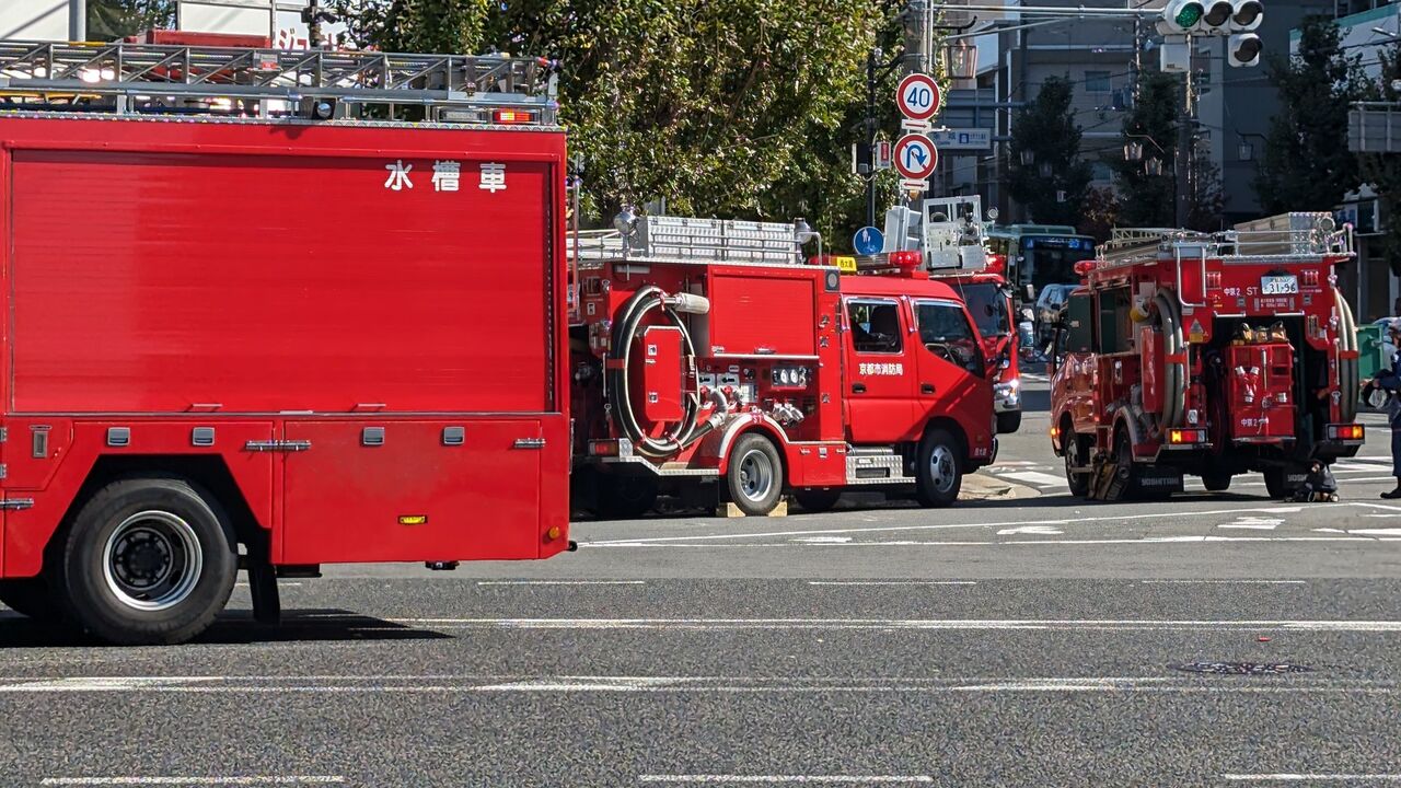 円町駅の交差点でめっちゃ消防車がサイレン鳴らしながら集まってきてた