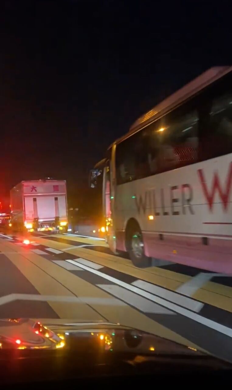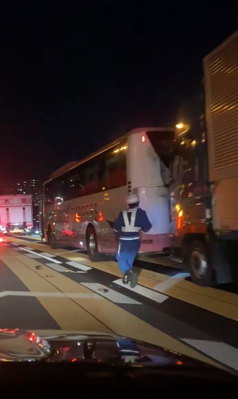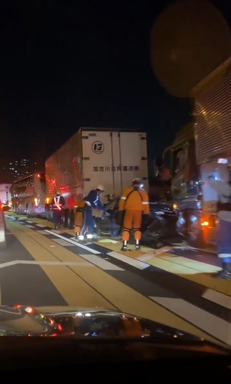 『草津JCTで大型トラック3台バス1台乗用車1台の計5台が絡む事故、、 バスの中お客さんいっぱい乗ってたし、乗用車トラックに挟まれてたけど大丈夫かな.』
