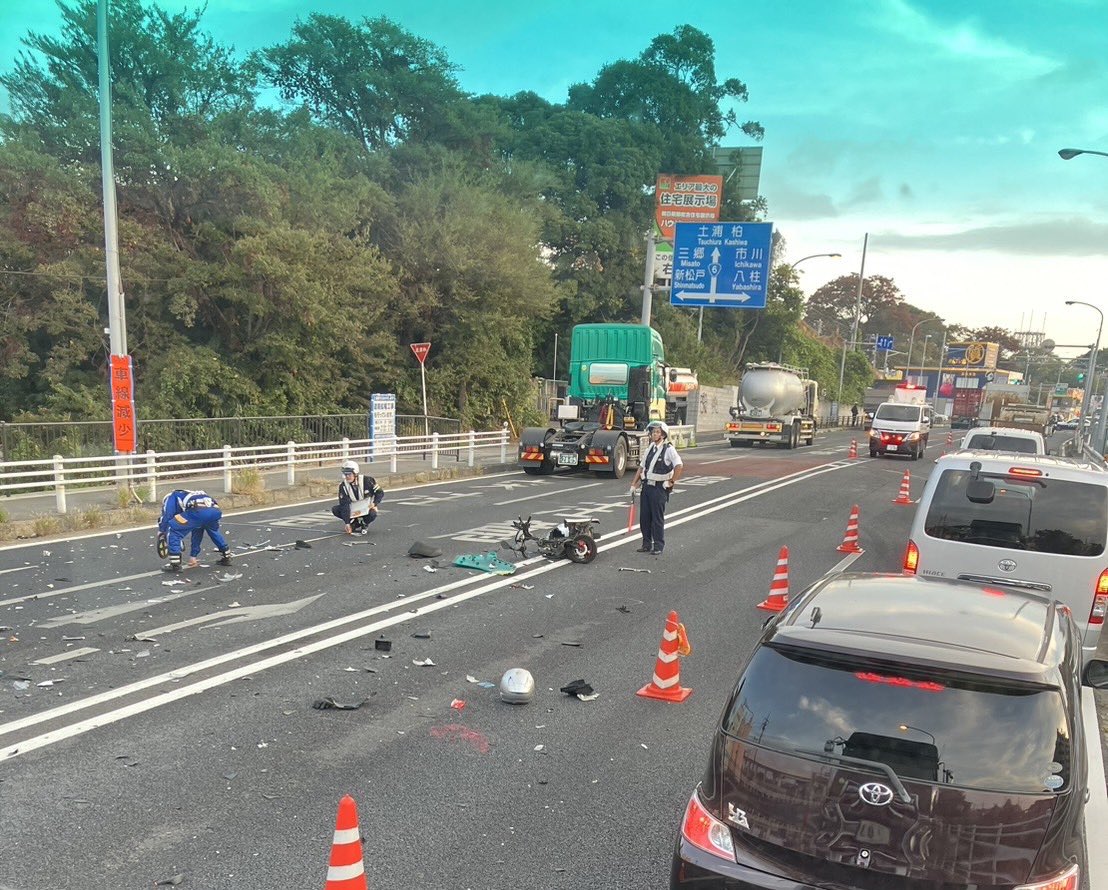 【現場の様子】#交通情報 #国道6号 上り 千葉県松戸市小金消防署入口交差点付近 破片散乱大型トレーラー乗用車バイク事故で一時通行止め渋滞 下りも一時規制11月16日 #通行止 #千葉 #松戸