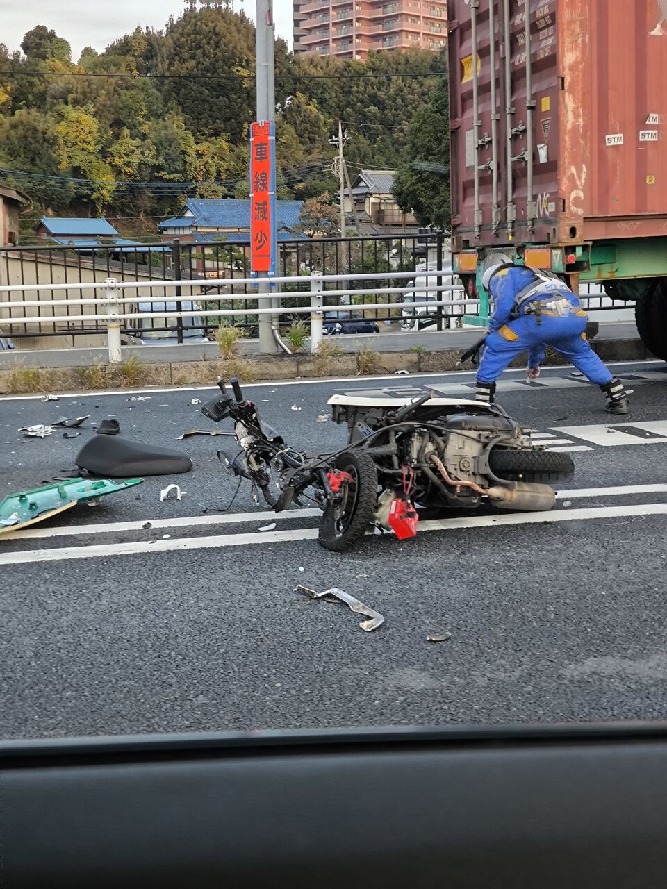 大方ベンツとトレーラーの間をすり抜けしたのか向きと部品の飛び方からしたら対面衝突か pic.twitter.com/Khe5DlYRH8— 都会の宅窓から (@tokainomado) November 15, 2024