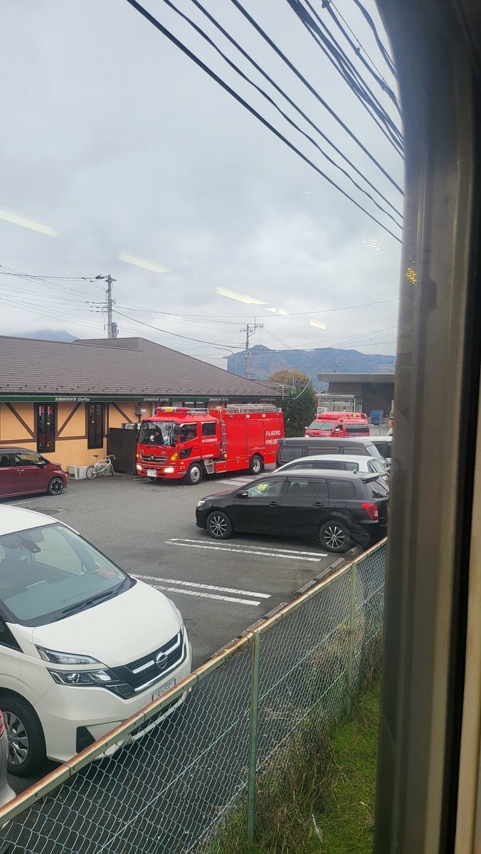 『富士山駅~富士急ハイランド間で踏み切り内に人立ち入りで人身事故。今、消防車到着。』