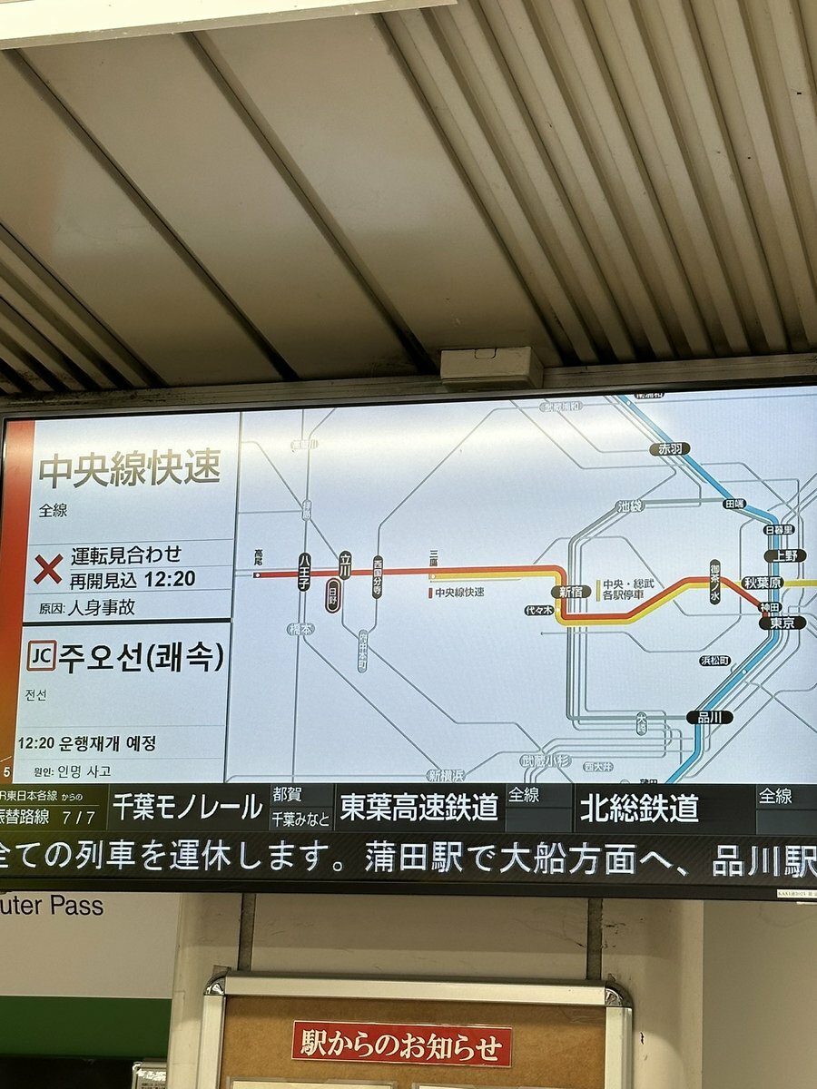 中央線快速電車は、御茶ノ水駅での人身事故の影響で、東京〜新宿駅間の上下線で運転を見合わせています。運転再開は12時40分頃を見込んでいます。新宿〜高尾駅間は… #中央線快速電車 #Chuo_Line https://t.co/Bw82N3lIYZ— JR東日本【中央方面】運行情報 (公式) (@JRE_F_Chuo) November 16, 2024