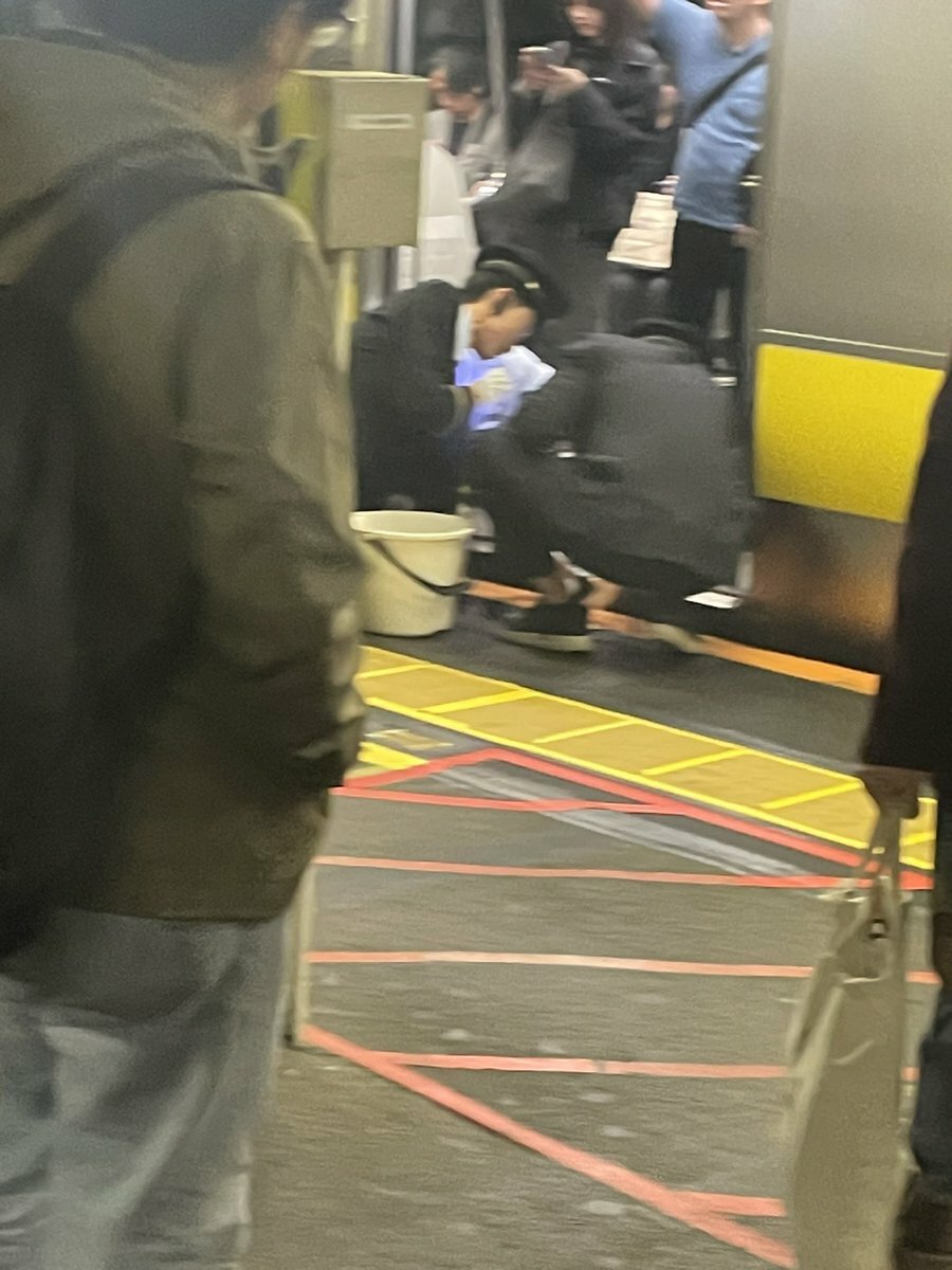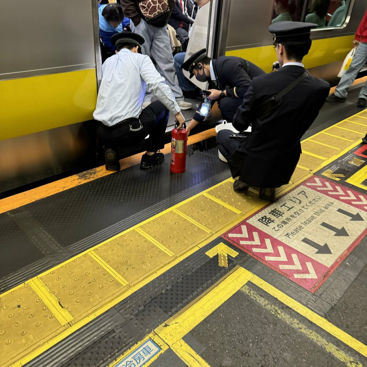 『中央総武線新宿駅で、非常停止ボタン押されて停車、職員が消化器やバケツの水持って何やら物騒な模様 爆発しても怖いから乗り換えた方が無難だ』