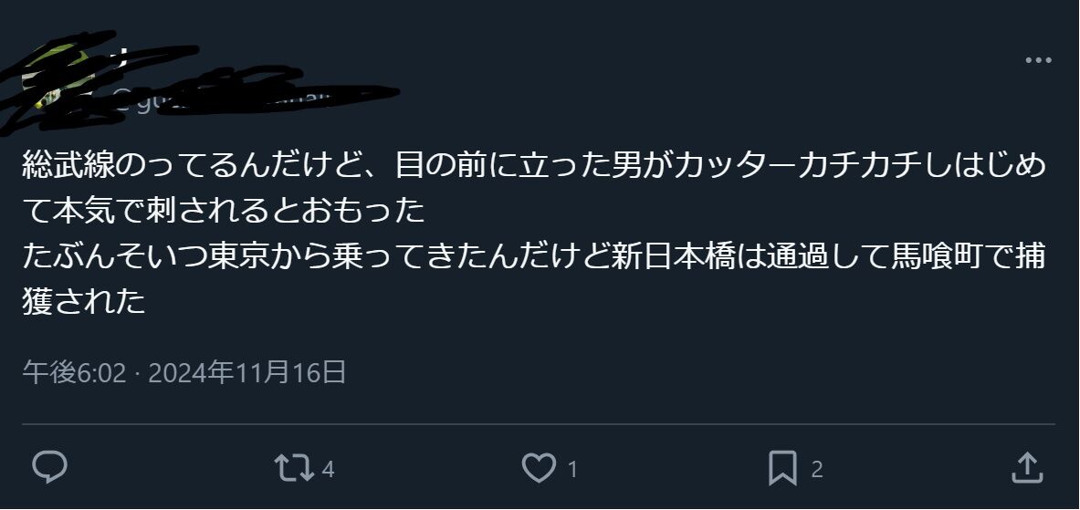 『総武線のってるんだけど、目の前に立った男がカッターカチカチしはじめて本気で刺されるとおもった