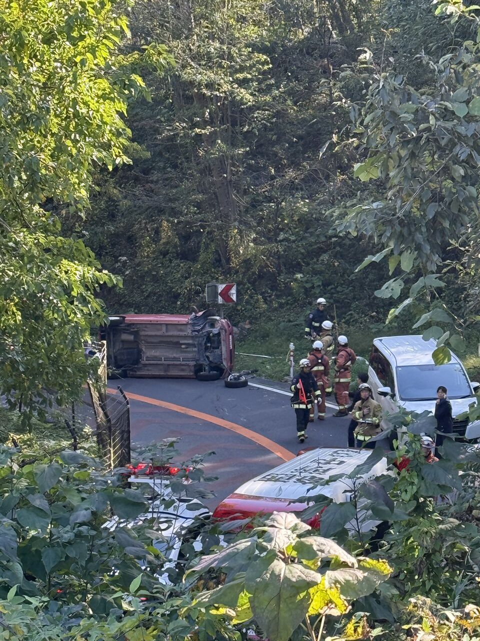 狭山湖のちっちゃい山道的なところ事故渋滞、ガッツリ横転してました