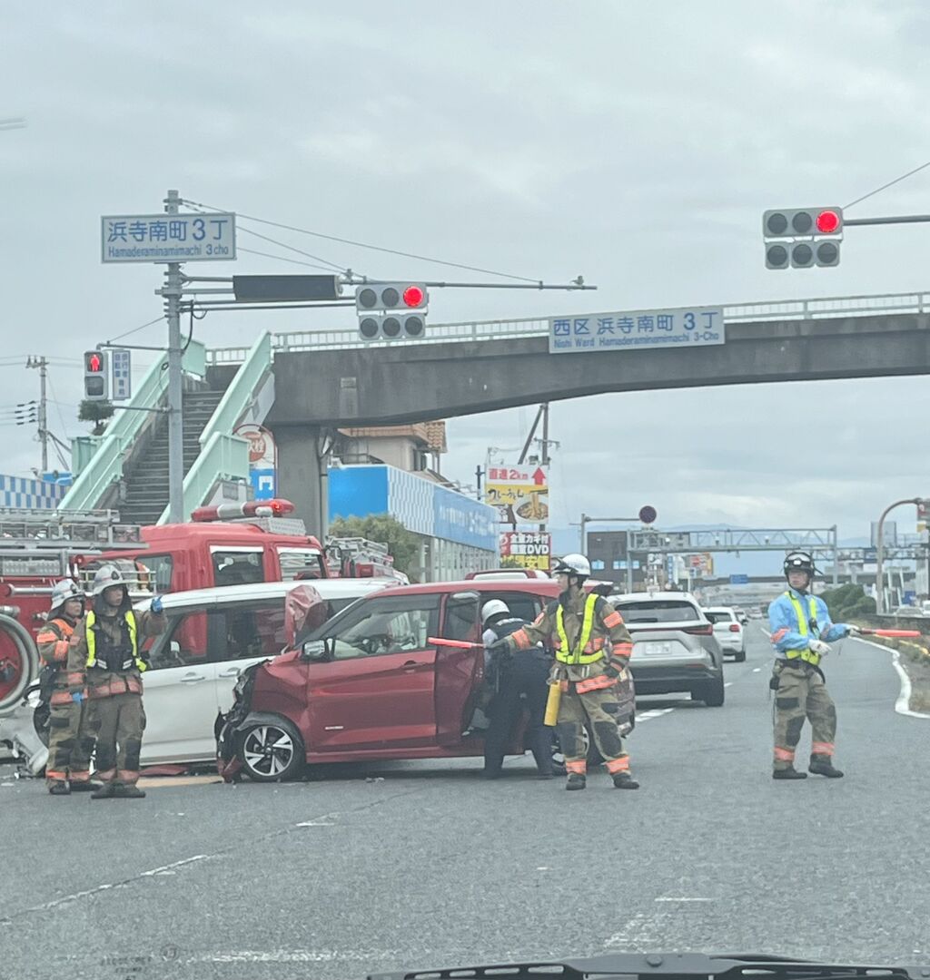 【現場の様子】#交通情報 第二阪和国道 南行き 大阪府堺市西区浜寺南町3丁交差点歩道橋付近 車両大破複数台絡む衝突事故で規制渋滞11月17日 #渋滞 #大阪 #堺