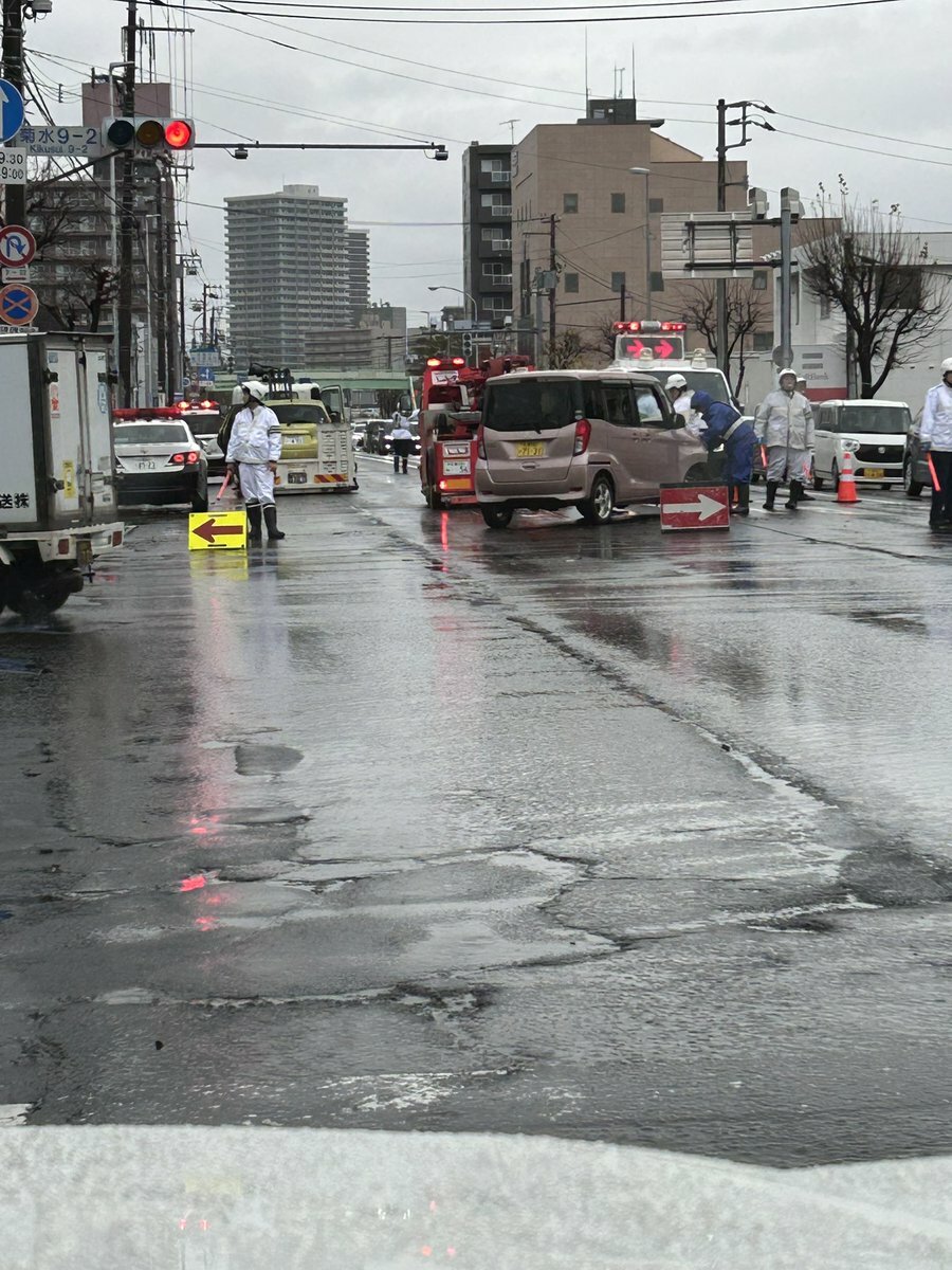 【現場の様子】#交通情報 #国道12号 札幌江別通り 札幌市白石区菊水上町1条2丁目交差点付近 車両フロント大破事故で一部規制渋滞11月17日 #渋滞 #札幌