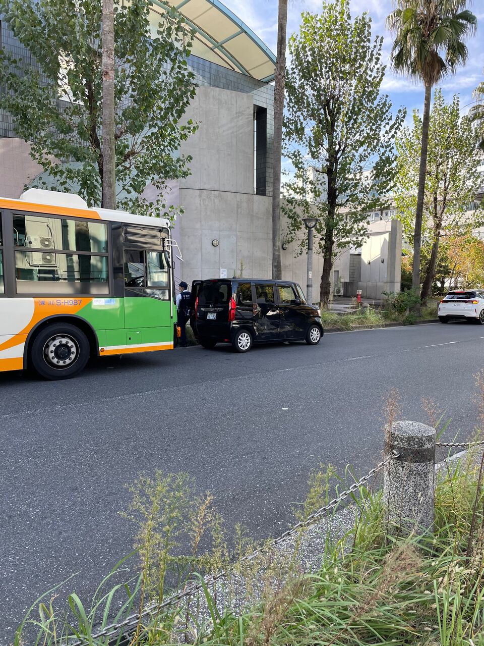 バスと乗用車の接触事故が目の前で起こってびっくりしたー