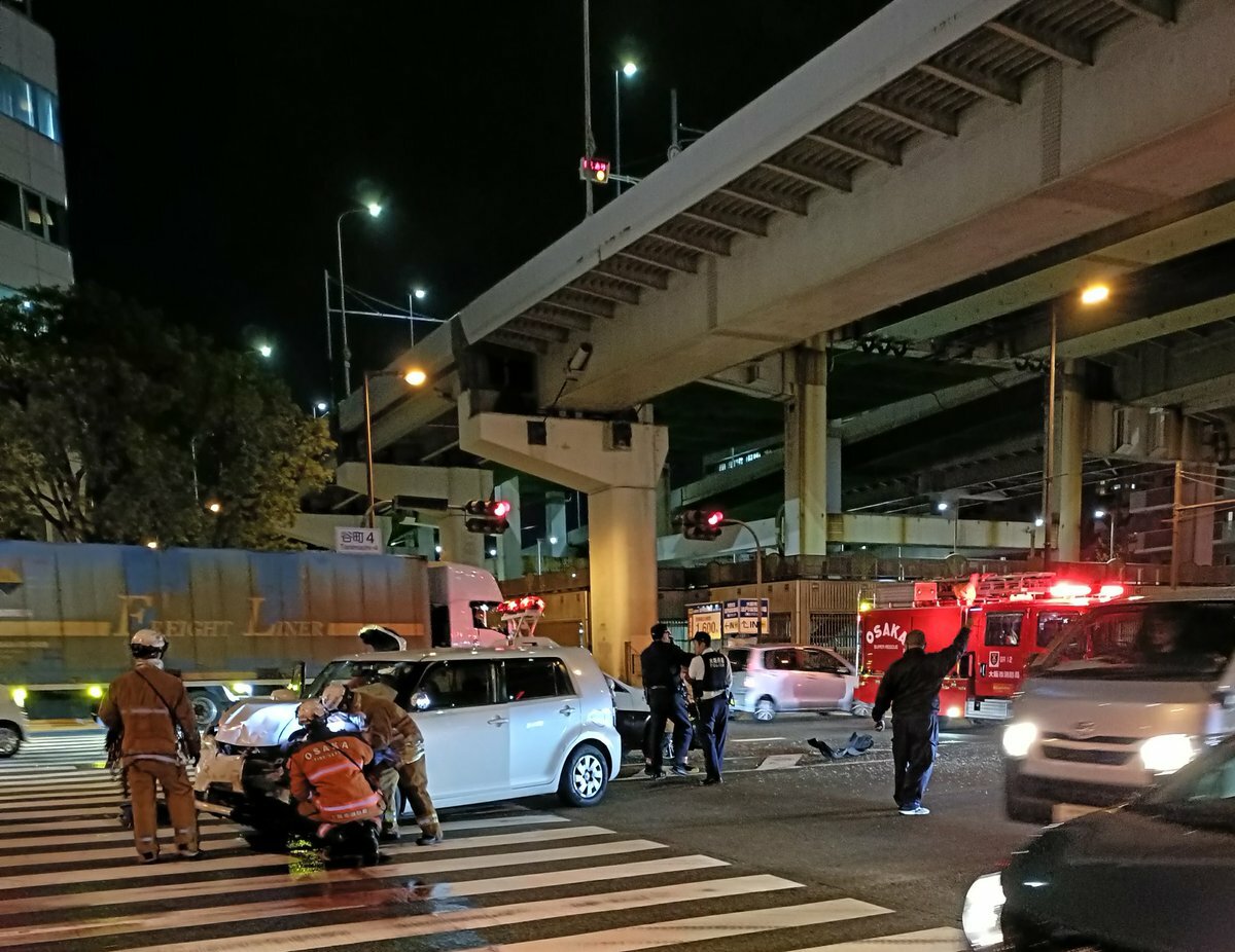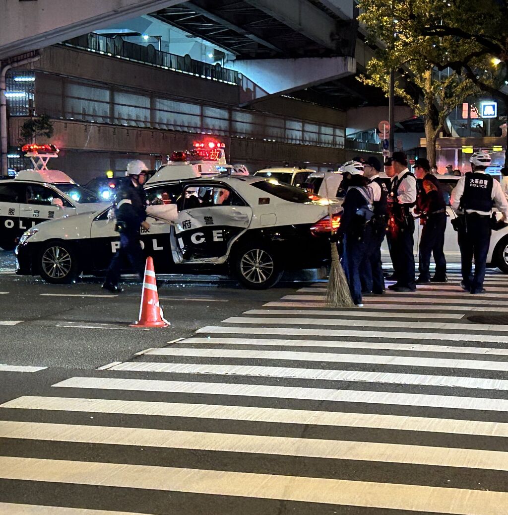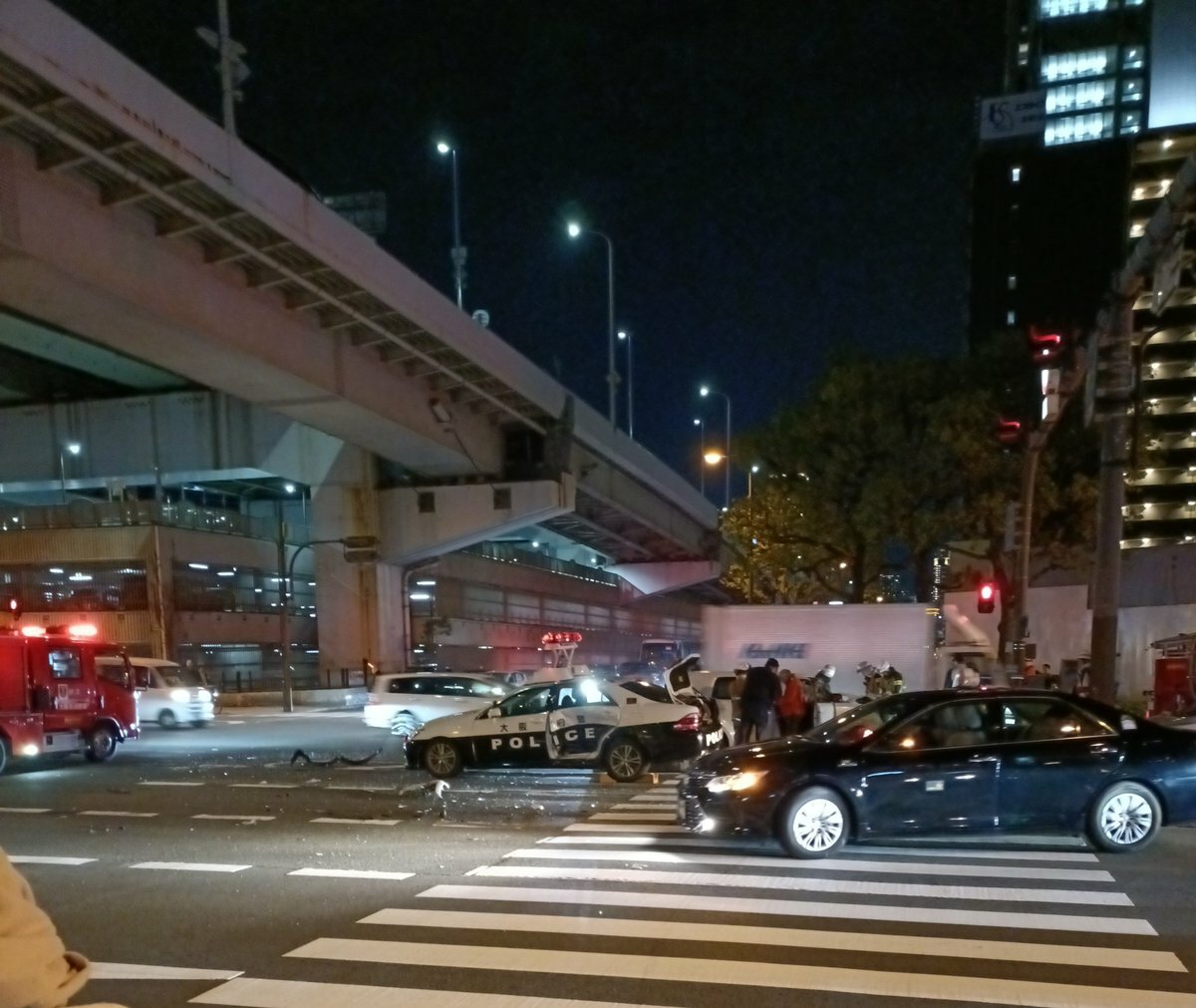 【現場の様子】#交通情報 谷町筋 大阪府大阪市中央区谷町4丁目交差点付近 破片散乱パトカーと乗用車衝突大破事故で南北規制渋滞11月19日 #渋滞 #大阪 #谷4