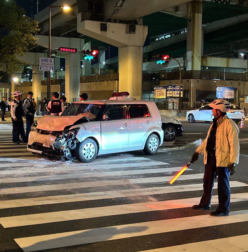 『谷4交差点めちゃくちゃな事故してる。パトカー中央分離帯乗り上げて軽自動車半分になっててやばい』