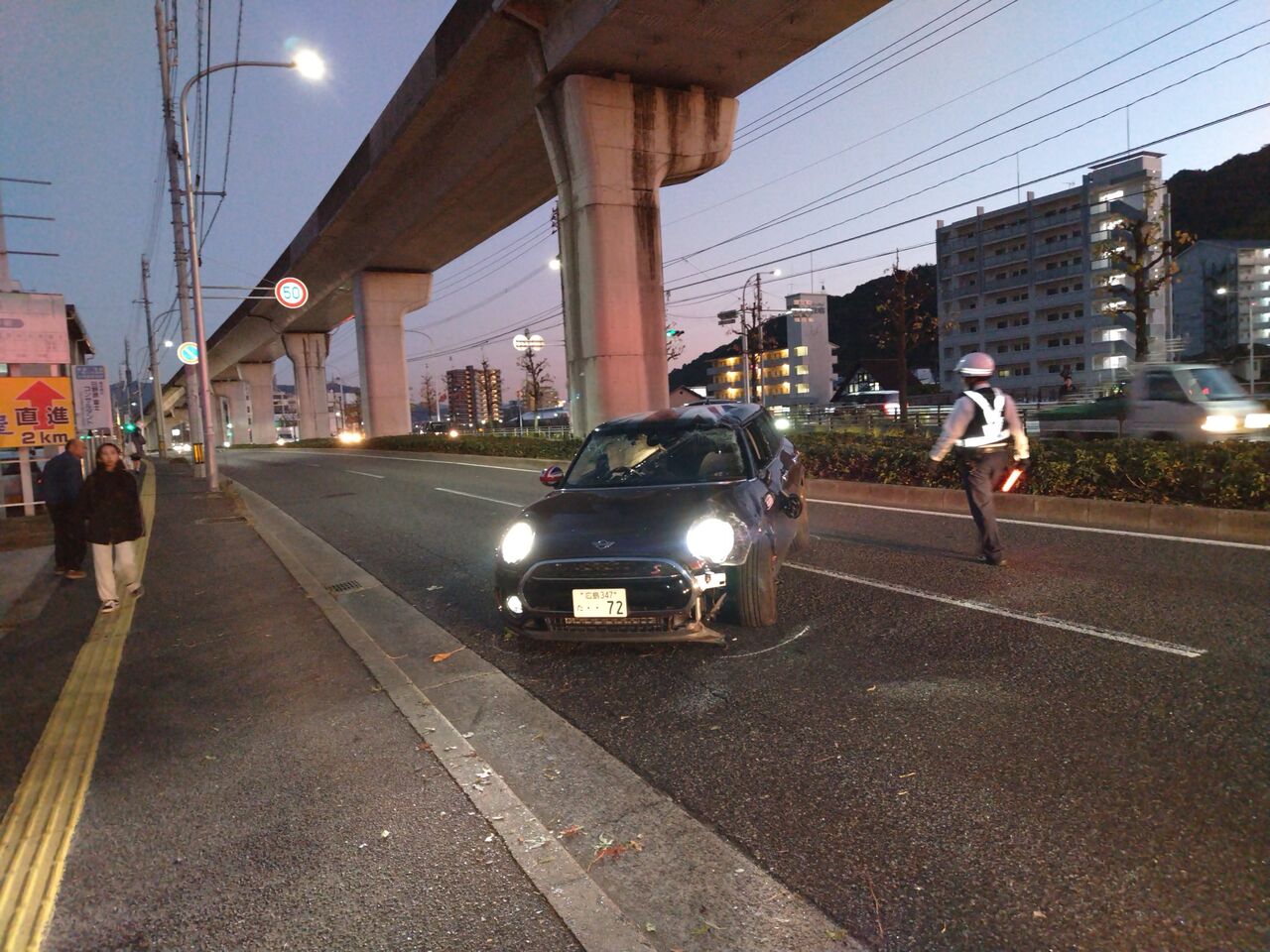 『安東小学校入口で左方接触横転事故で通行止め 』