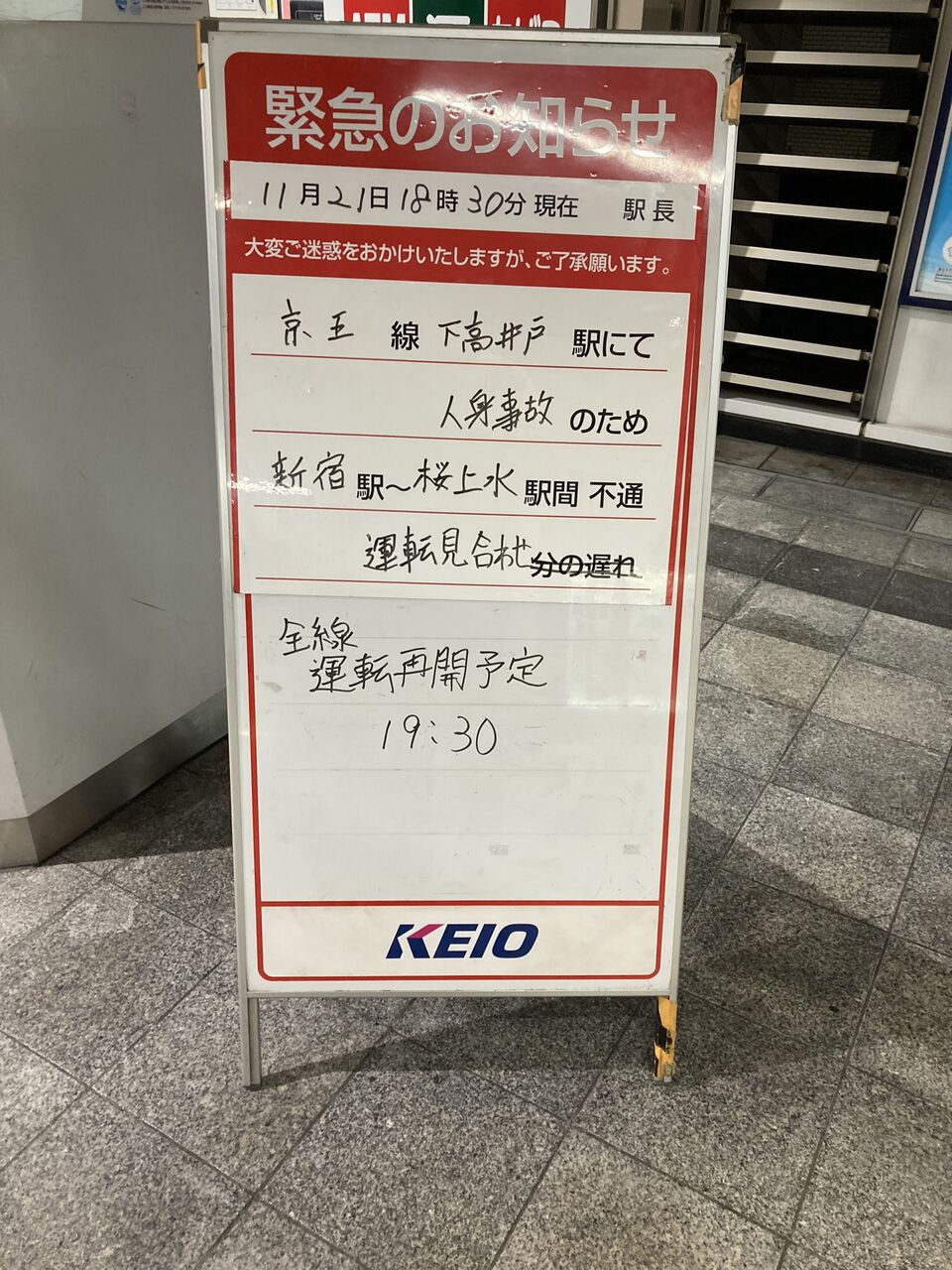 【現場の状況】『朝は仙川、夜は下高井戸で人身事故 帰宅ラッシュ直撃利用者困惑』#京王線 下高井戸駅で人身事故 #都営新宿線 など遅延11月21日 #下高井戸