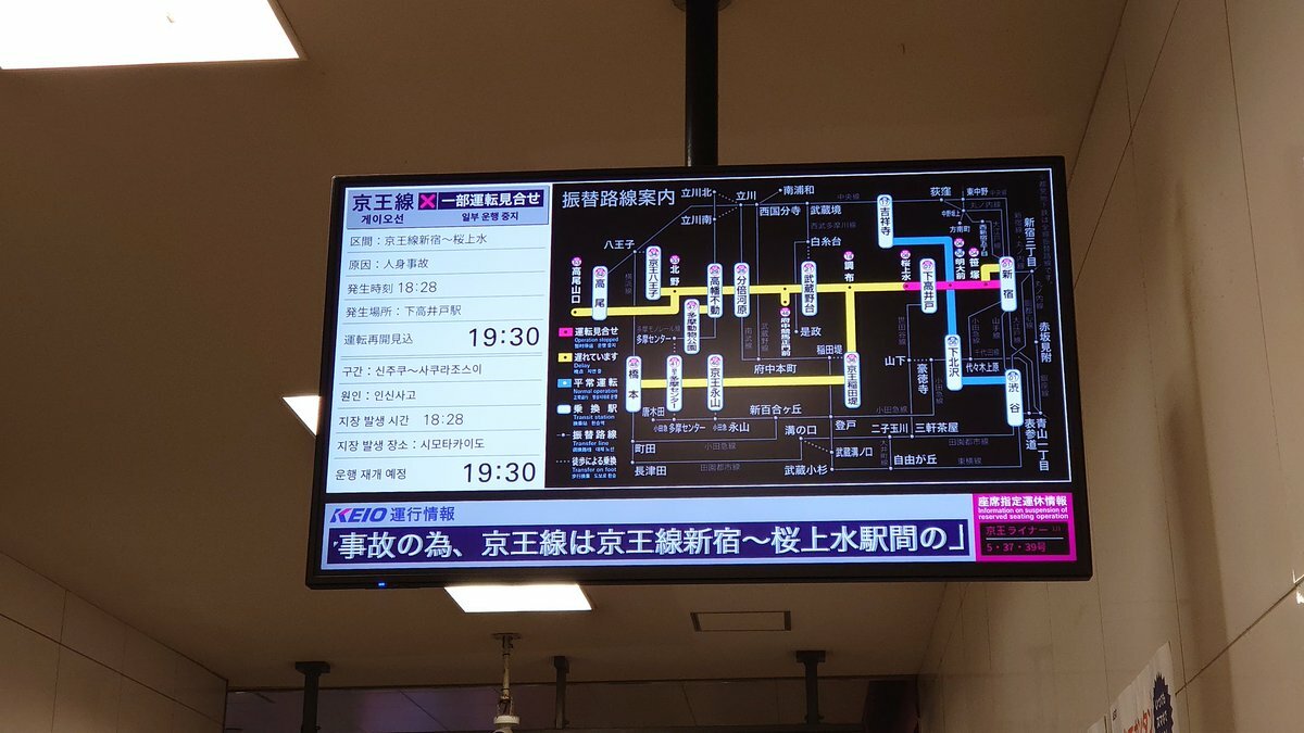 【京王線 一部運転見合せ】発生時刻:18時28分/発生場所:下高井戸駅/原因:人身事故/見合せ区間:京王線新宿〜桜上水駅間上下線/振替輸送:実施中/運転再開見込:19時30分頃https://t.co/S5AXqOFyjr