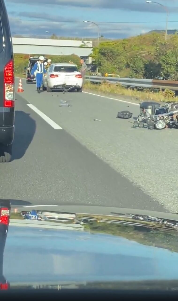 バイクと乗用車?バイクの人が倒れてた…