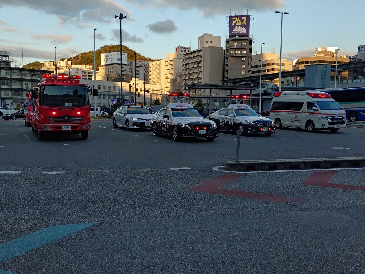 『広島駅新幹線口のタクシー待機場所に消防車とパトカーと救急車がきてトイレが使用不可能な状態になってた』