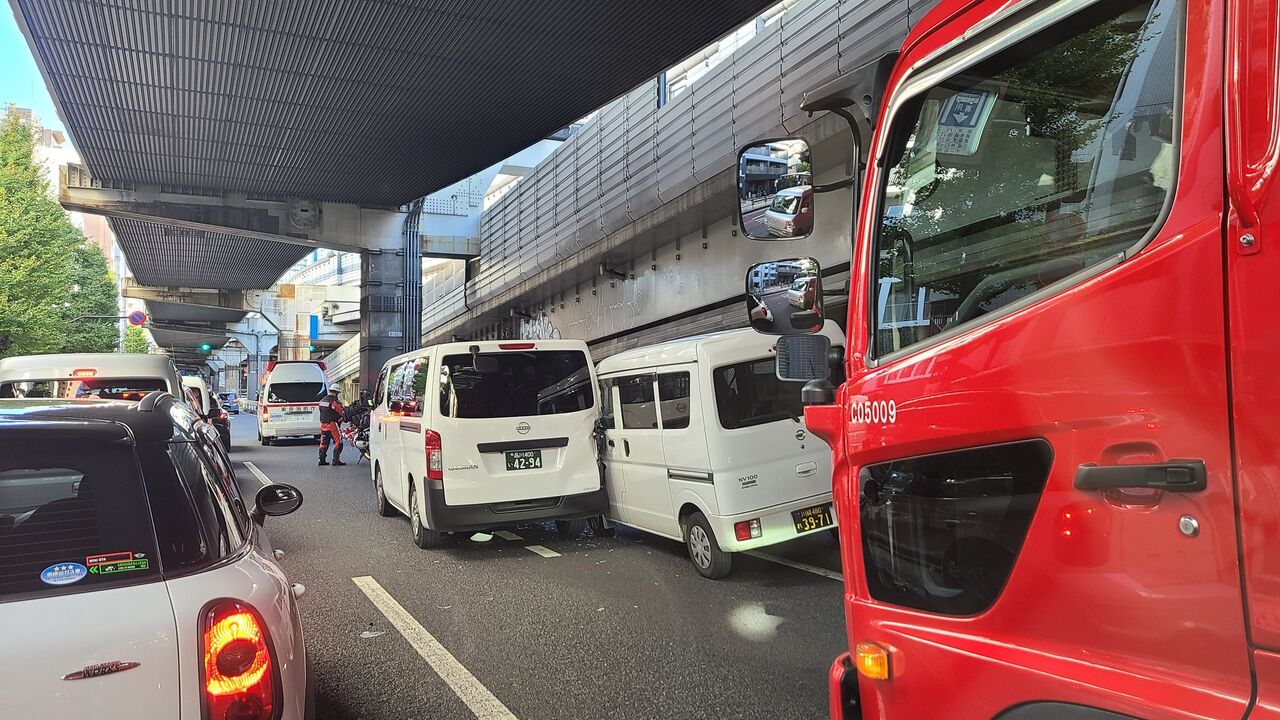 【現場の様子】#交通情報 #国道246号 上り 東京都世田谷区池尻付近 車線塞ぐワゴン車軽バン衝突事故で規制渋滞11月25日 #渋滞 #世田谷 #池尻 #三宿 #三軒茶屋