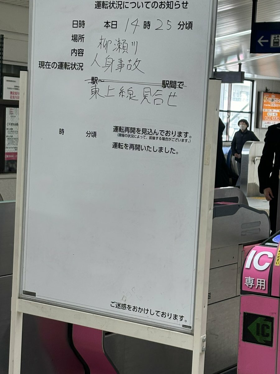 乗ってた電車が柳瀬川過ぎた途端人身事故で止まった