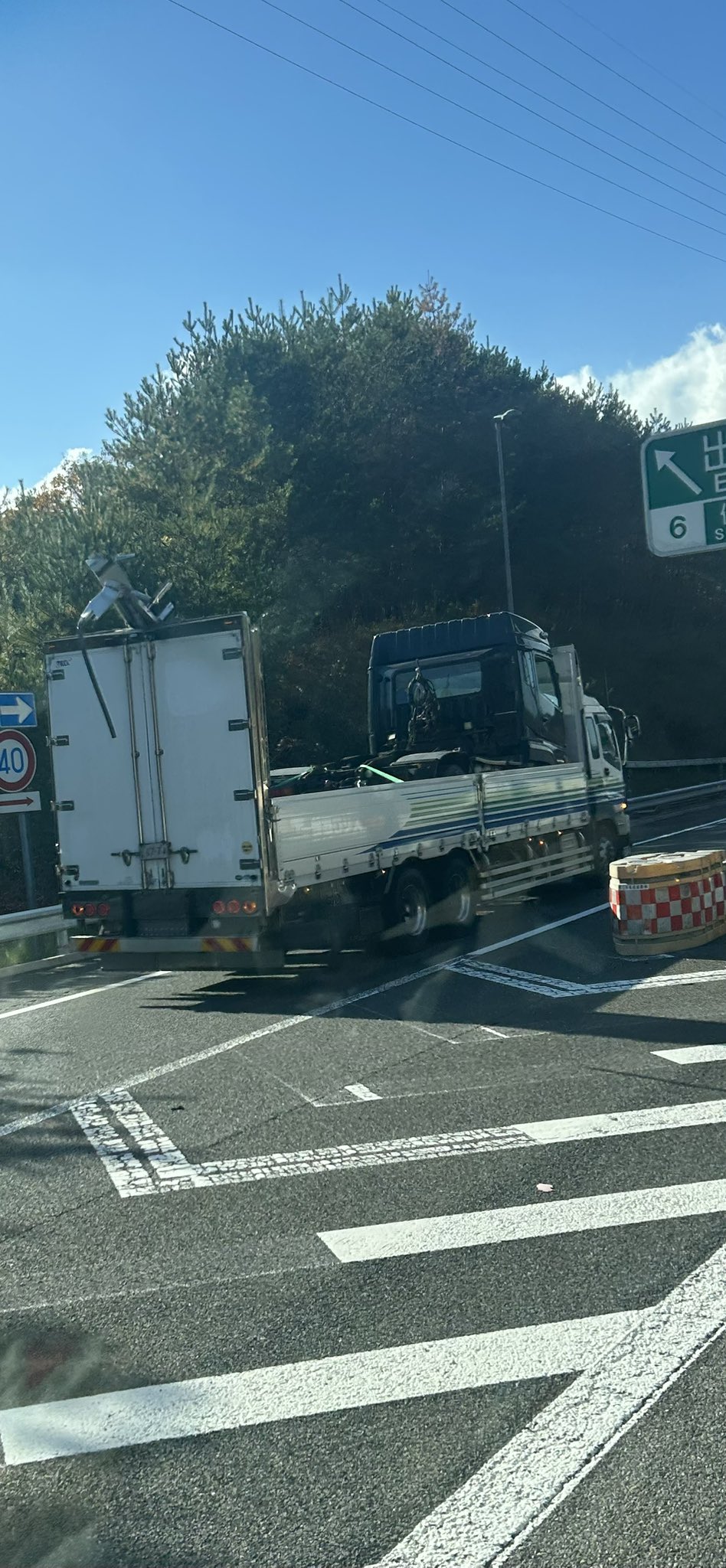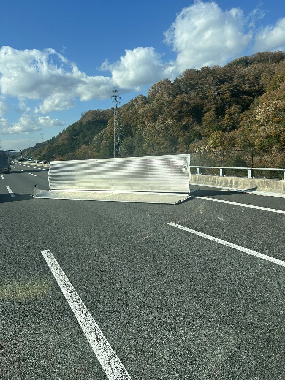 『信楽インター手前で10tウイングのウイングが落ちて追い越しと第一走行車線規制中です。』