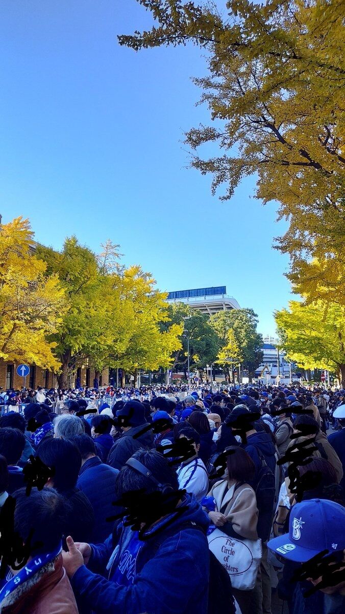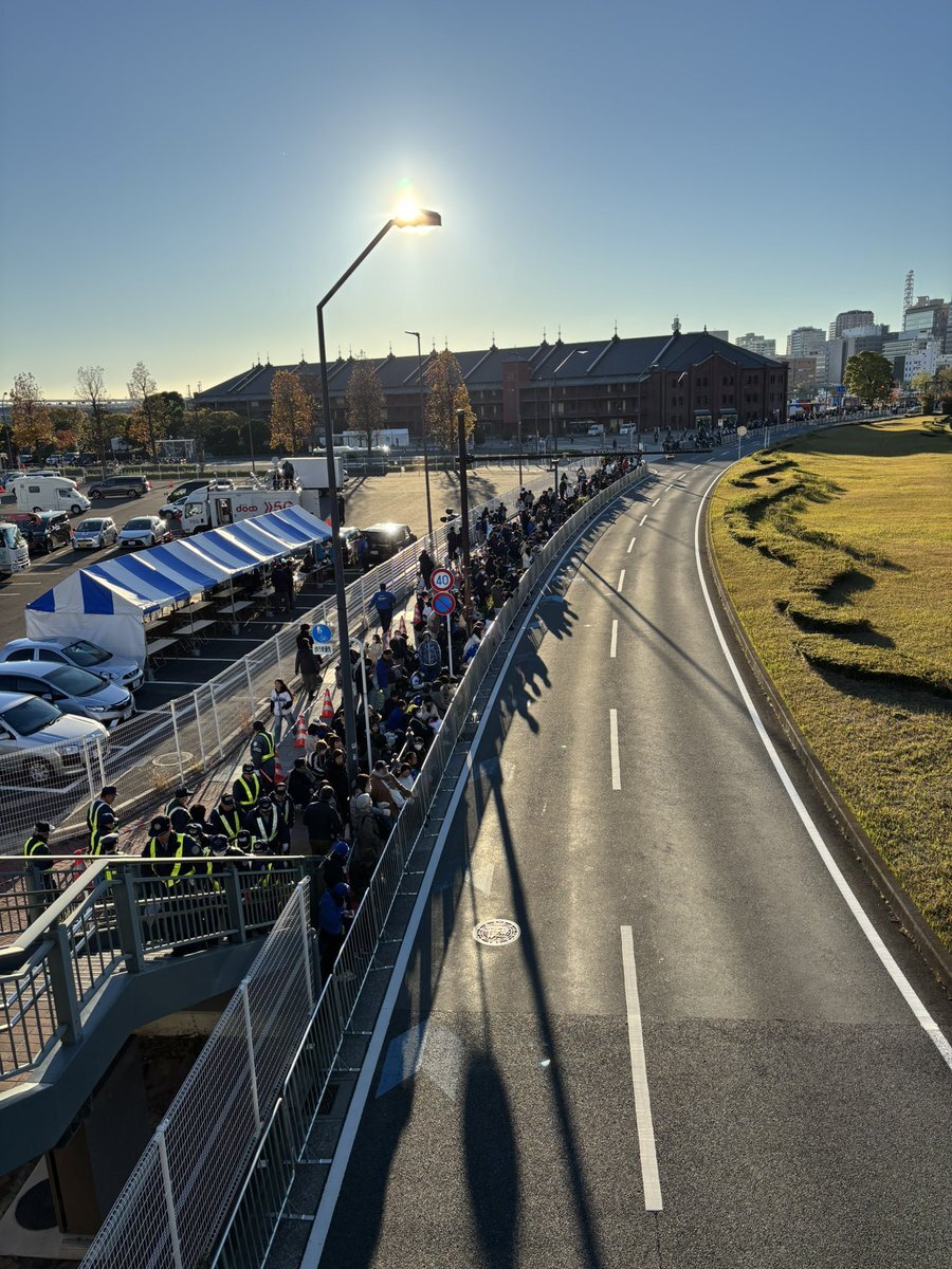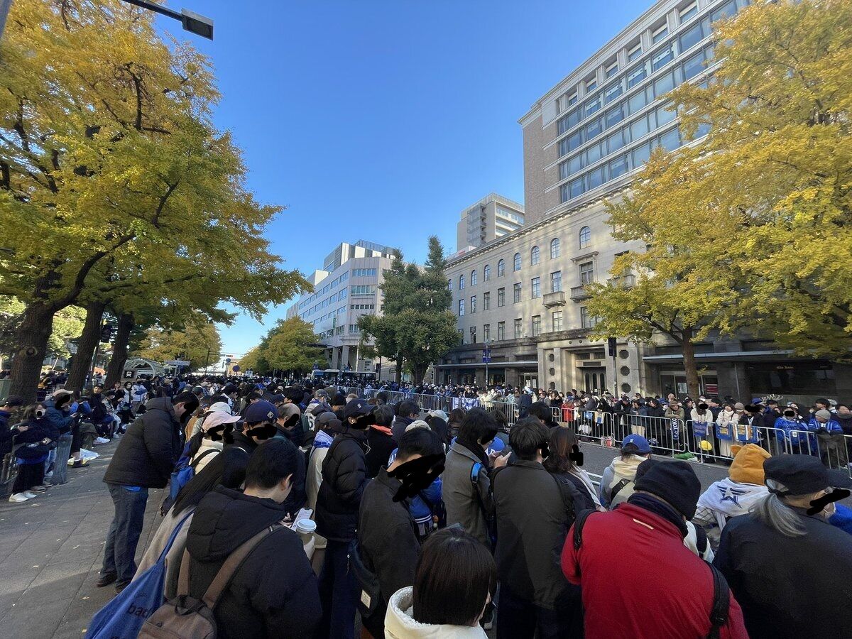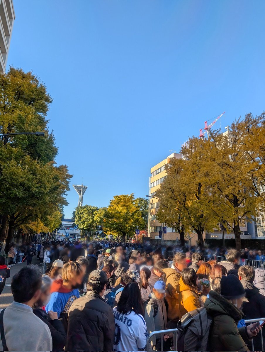 歩道の中央に三角コーンが置かれ、二人立てるぐらい。ここから赤レンガ方向、日本大通り方向ともにほぼ埋まっています。あと2時間半。どれほど人が増えるんでしょう。#baystars pic.twitter.com/OL4MPm39qb— ジーン (@fp_jn12766tm) November 29, 2024