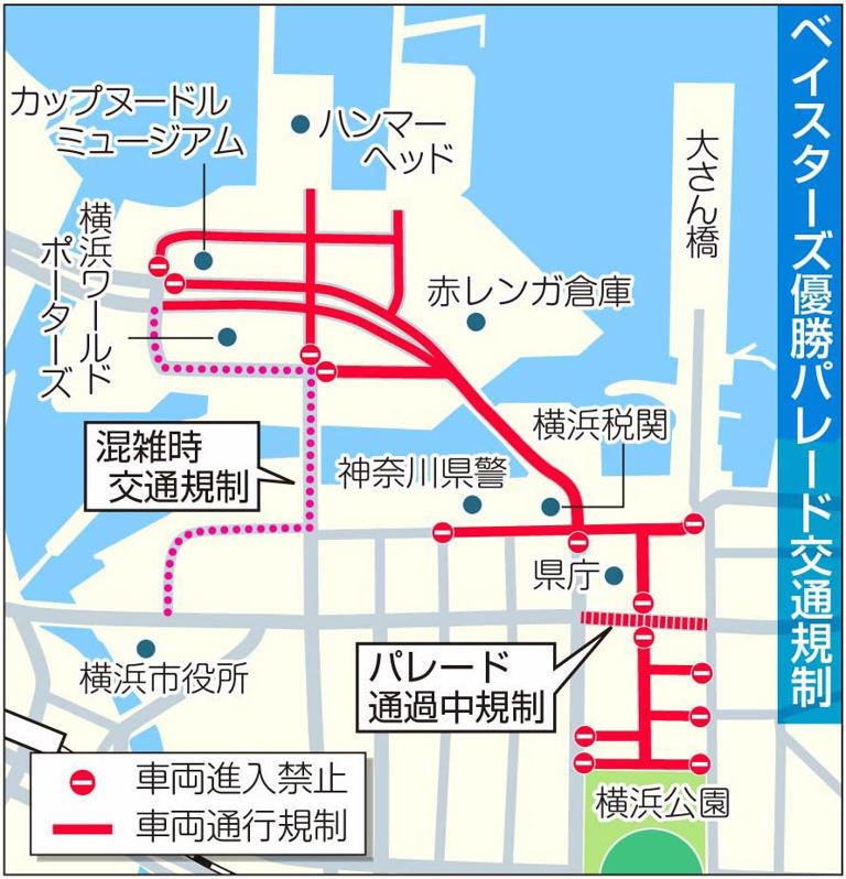 明日開催される「横浜DeNAベイスターズ優勝パレード2024」の実施に伴い、朝8時から13時頃(混雑の度合いによって前後いたします)までの間、日本大通り駅2番出口を閉鎖いたします。ご利用のお客様には、ご不便をおかけいたしますが、ご理解とご協力を賜りますようお願いいたします。 pic.twitter.com/URrY29z1ia