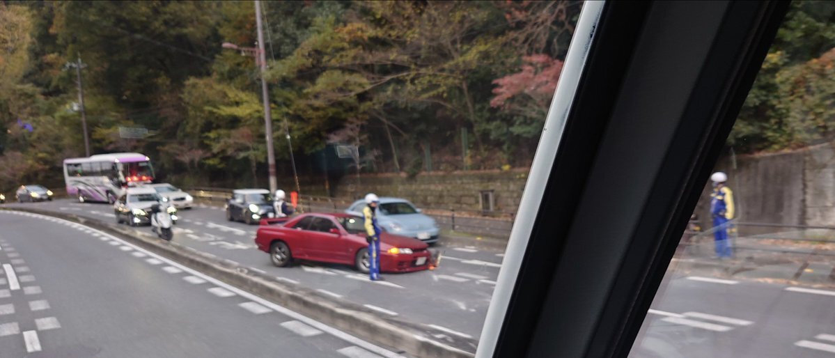 【現場の様子】#交通情報 三条通り 下り 京都市山科区日ノ岡夷谷町 九条山付近 日産スカイラインGT-R R32事故で規制渋滞11月30日 #京都 #九条山 #GTR