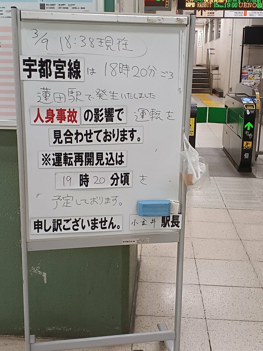 仕事が終わり、小金井駅に着いたら、蓮田駅で人身事故のため、足止め。 pic.twitter.com/d55GNdcLdC