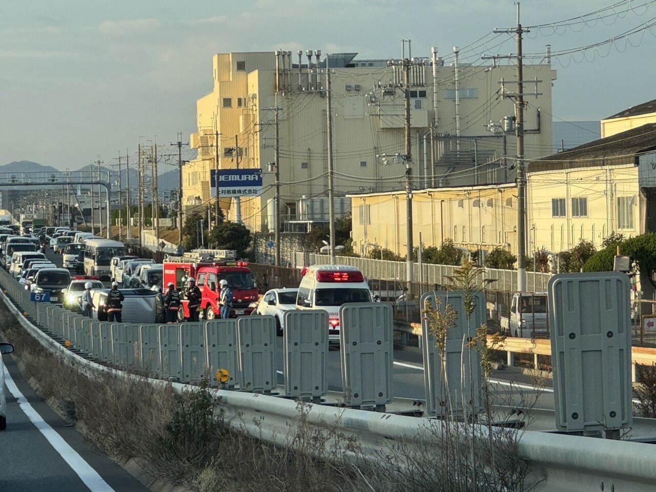 【現場の様子】#交通情報 #国道2号 加古川バイパス 東行き 兵庫県明石市中岡付近 車線塞ぐ衝突横転事故で規制渋滞12月1日 #渋滞 #明石 #加古川 #師走