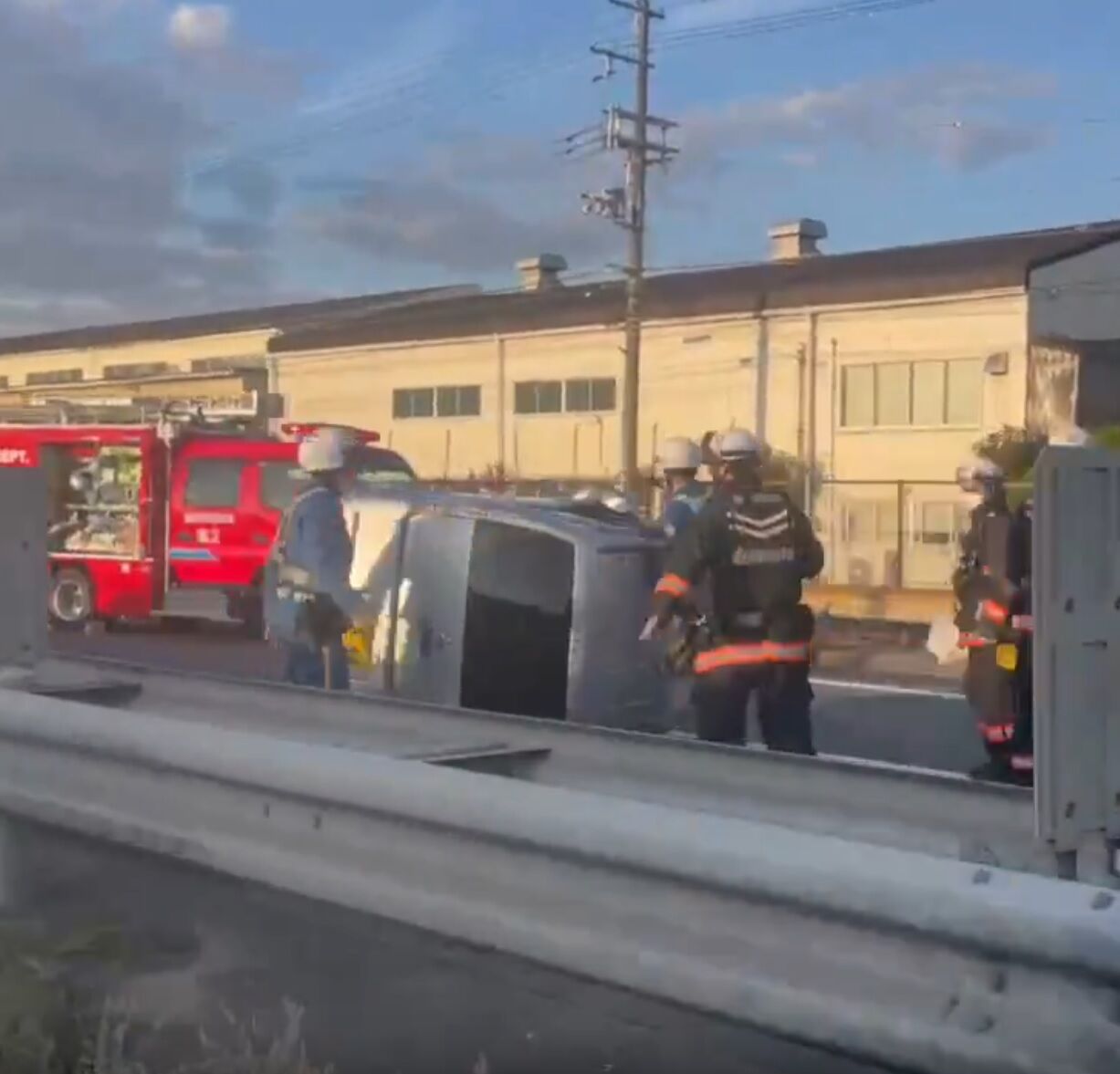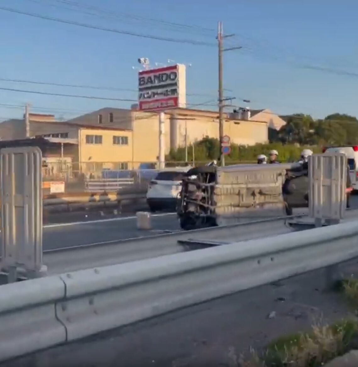 『加古川バイパス上り、加古川東過ぎたあたり横転事故。 2車線塞ぐ 加古川東から大渋滞 通る方気をつけて』