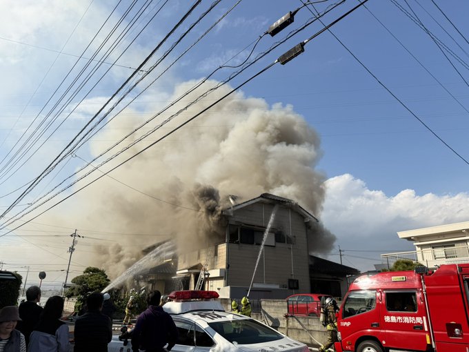 3日昼ごろ、徳島市の民家2棟が焼ける火事があり、現在も消防が消火にあたっています。