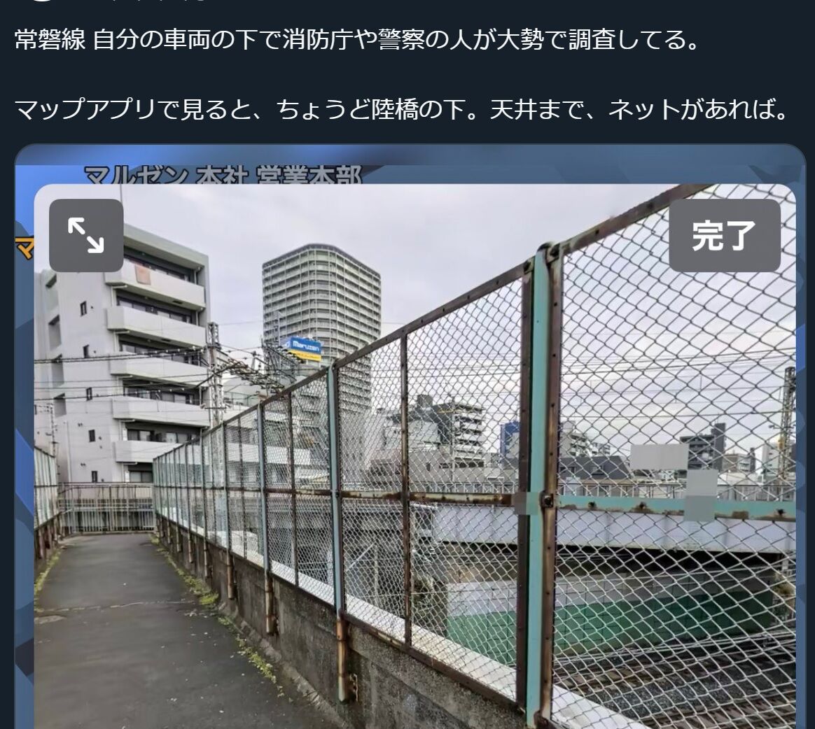 『常磐線 自分の車両の下で消防庁や警察の人が大勢で調査してる。
