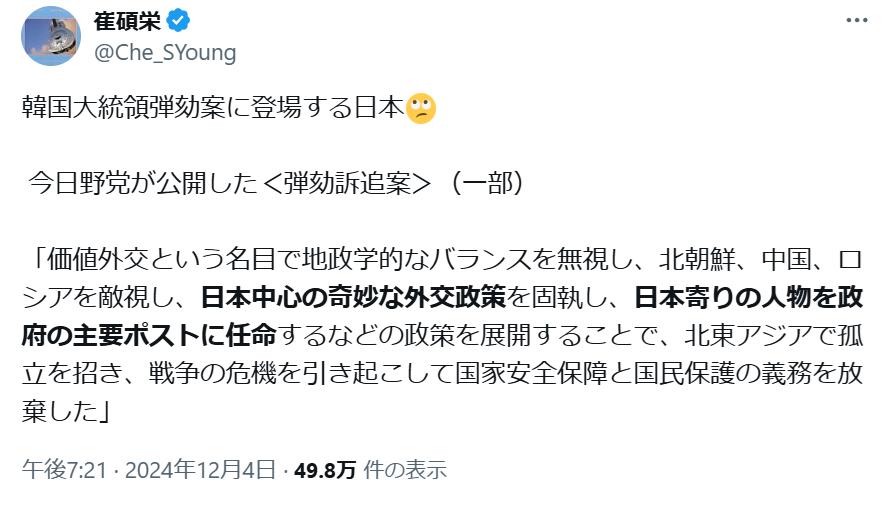 【超絶悲報】尹大統領の対日外交、弾劾の理由にされてしまう・・・ 2024/12/5 速報 1: 泣いた document.write(” + ”); 関連記事 document.write(” + ”); 続きを読む ——— Source: アルファルファモザイク 【超絶悲報】尹大統領の対日外交、弾劾の理由にされてしまう・・・