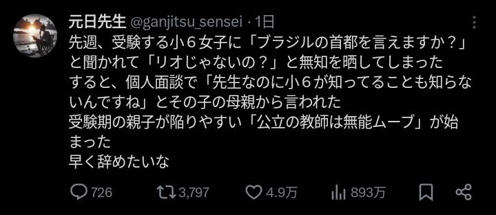 【悲報】小6女子「ブラジルの首都は?」先生「リオでしょ!」→結果 2024/12/5 速報 1: — (@ganjitsu_sensei) document.write(” + ”); 関連記事 document.write(” + ”); 続きを読む ——— Source: アルファルファモザイク 【悲報】小6女子「ブラジルの首都は?」先生「リオでしょ!」→結果